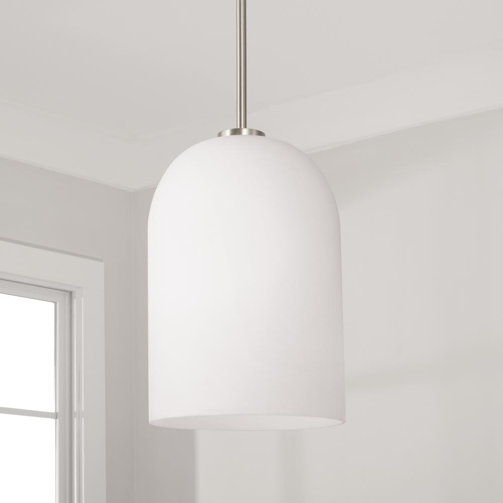 8.75"W x 13.5"H 1-Light Pendant in Brushed Nickel with Soft White Glass