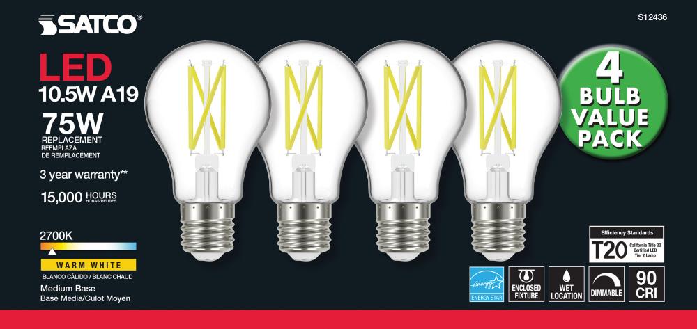 Satco's S12436 10.5-watt LED lamp is traditional, yet contemporary with its clear finish and energy saving LED technology. Elegantly illuminate any room in the house with this 4 pack of dimmable bulbs. Sophisticated and modern, this lamp delivers 15,00