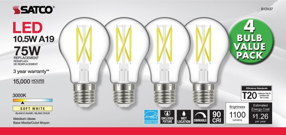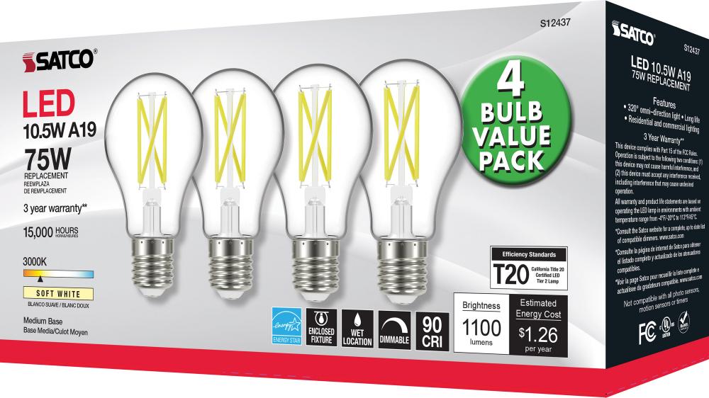 Satco's S12437 10.5-watt LED lamp is traditional, yet contemporary with its clear finish and energy saving LED technology. Elegantly illuminate any room in the house with this 4 pack of dimmable bulbs. Sophisticated and modern, this lamp delivers 15,00