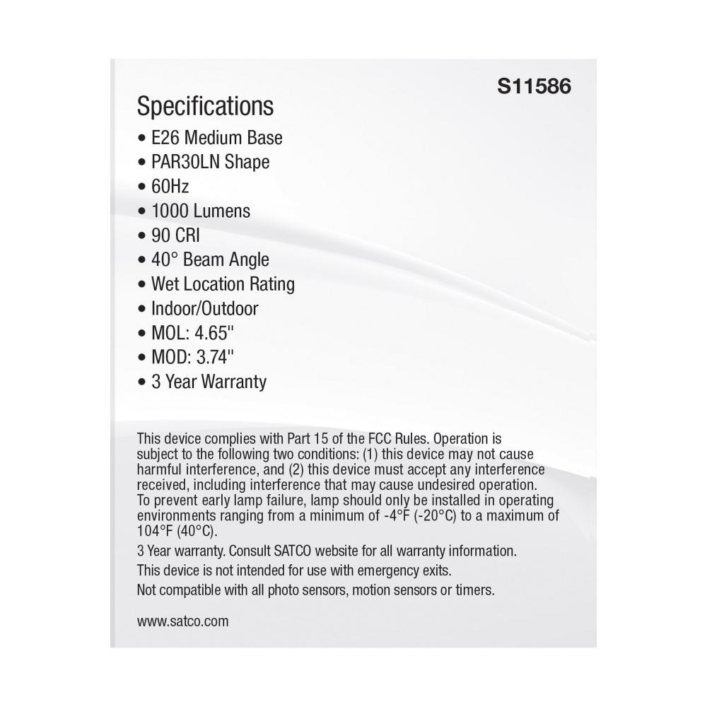 SATCO NUVO's LED S11586 PAR Lamp is the perfect solution for recessed and flood lighting. The PAR30 Long Neck 40 degree beam angle offers the best illumination for your application. Features a unique dial for the choice between 2700K/3000K/3500K/4000K/