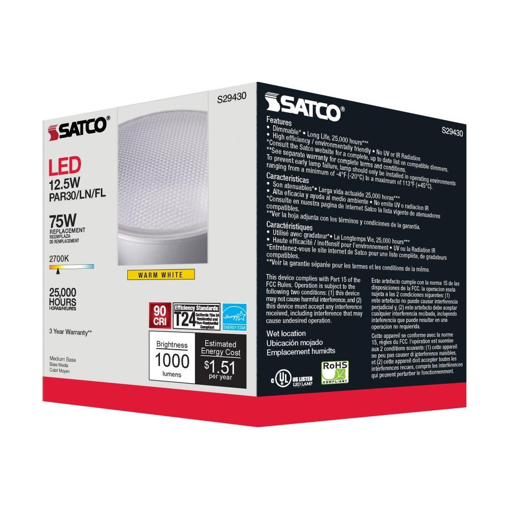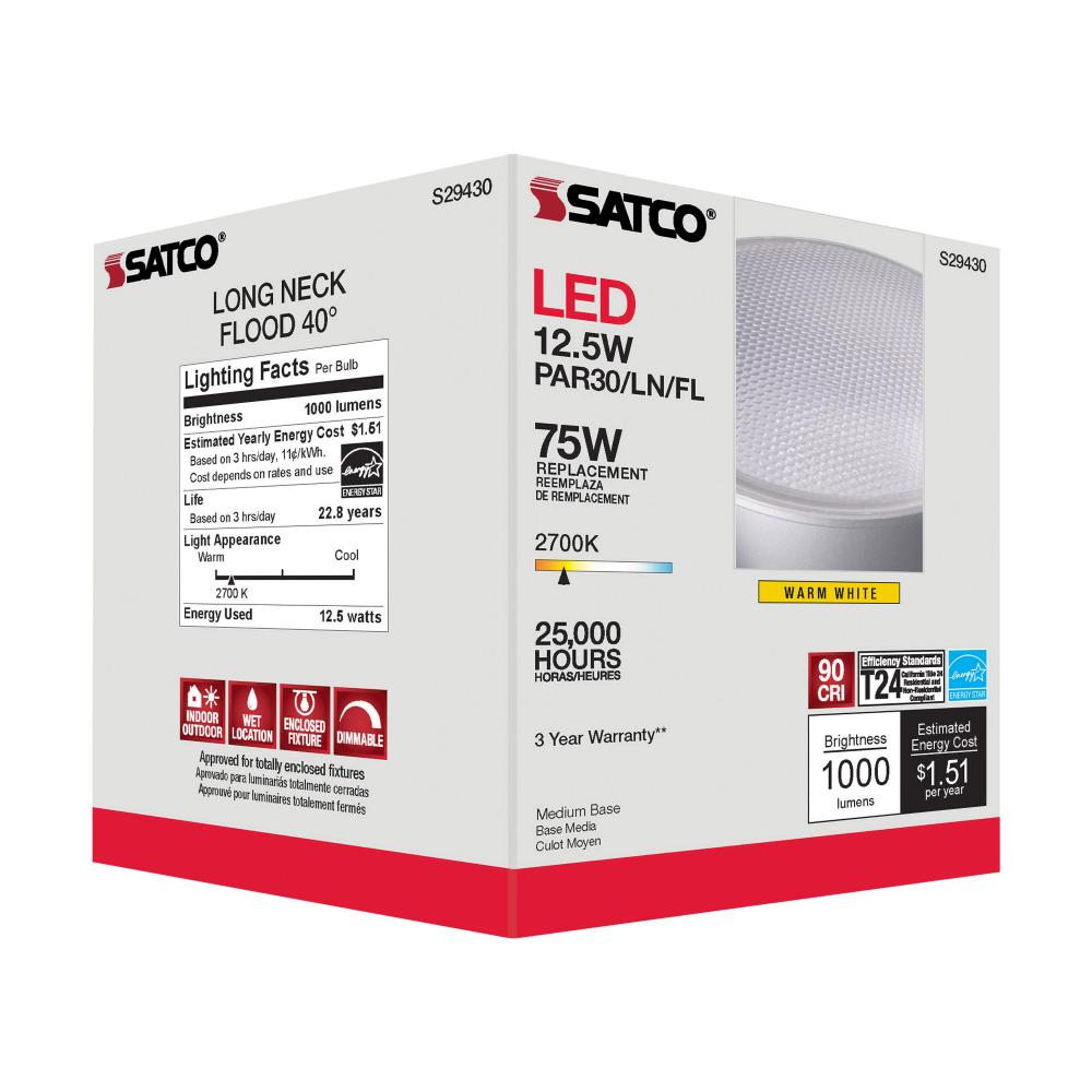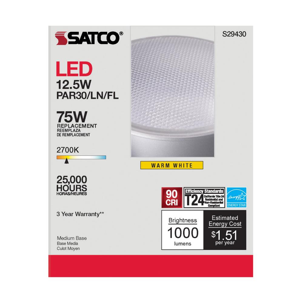 Satco's S29430 LED 12.5-watt, PAR30LN lamp maintains the familiar look of the Halogen PAR and Gen1 LED lamps they replace; but at 90 CRI and a higher lumens per watt ratio, it delivers superior light and improved efficiency. Designed for use in track,