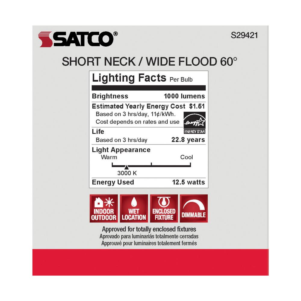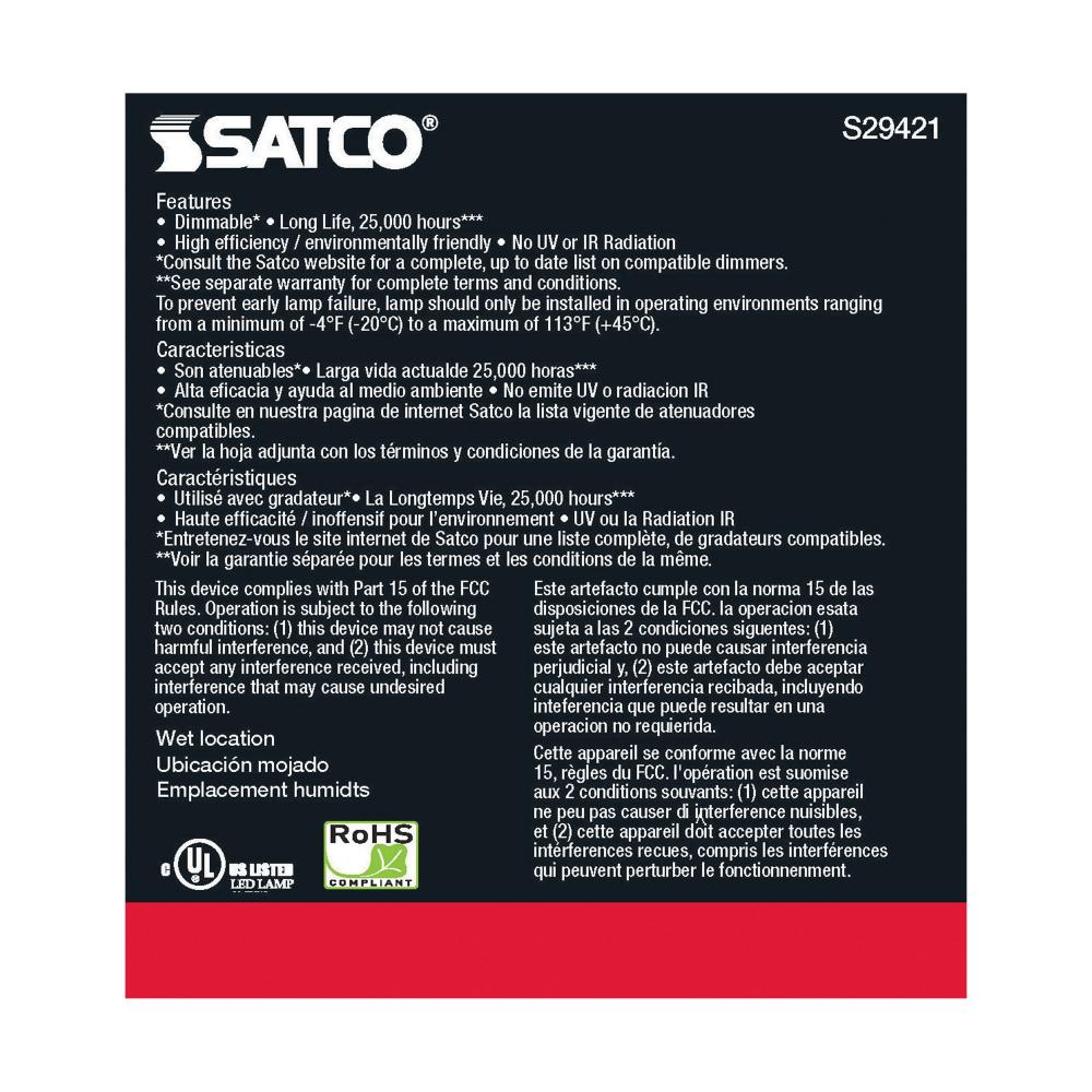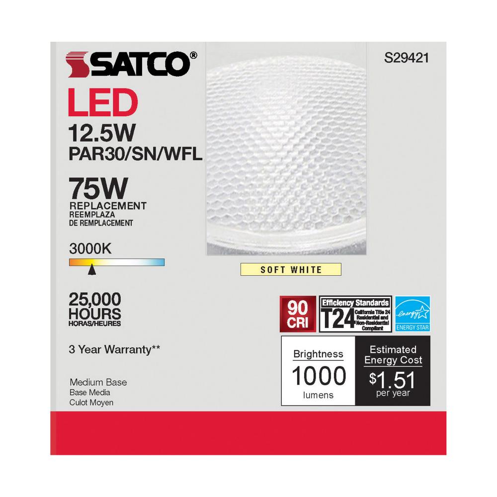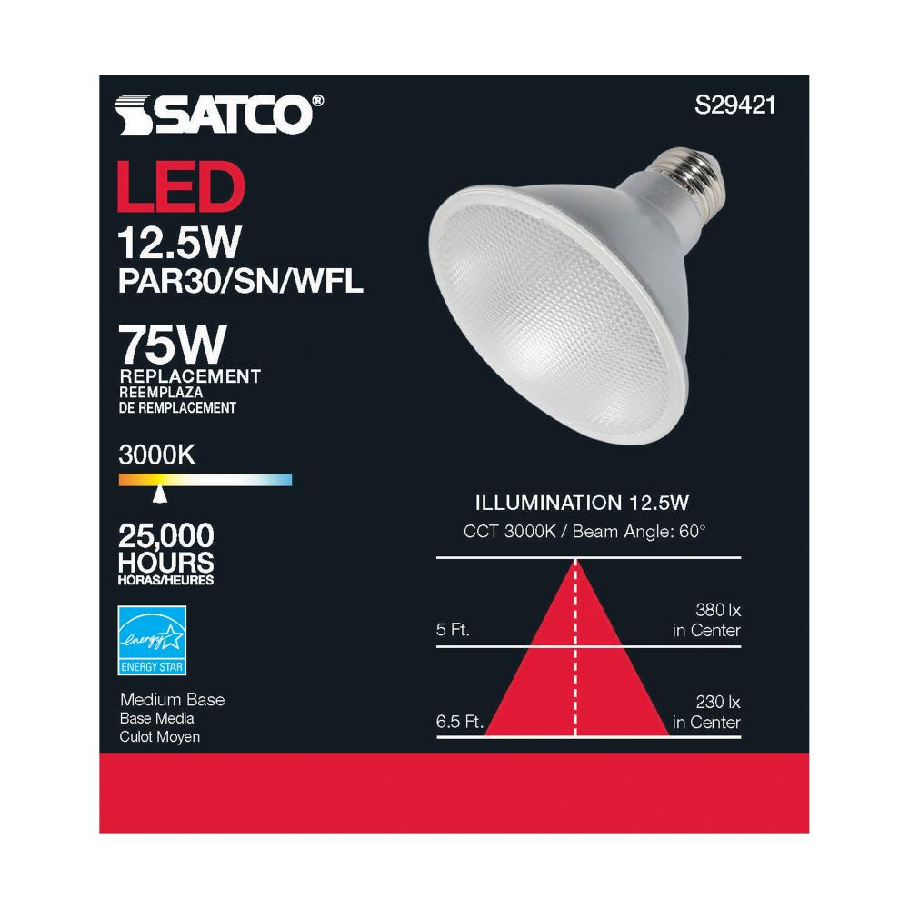 Satco's S29421 LED 12.5-watt, PAR30SN lamp maintains the familiar look of the Halogen PAR and Gen1 LED lamps they replace; but at 90 CRI and a higher lumens per watt ratio, it delivers superior light and improved efficiency. Designed for use in track,