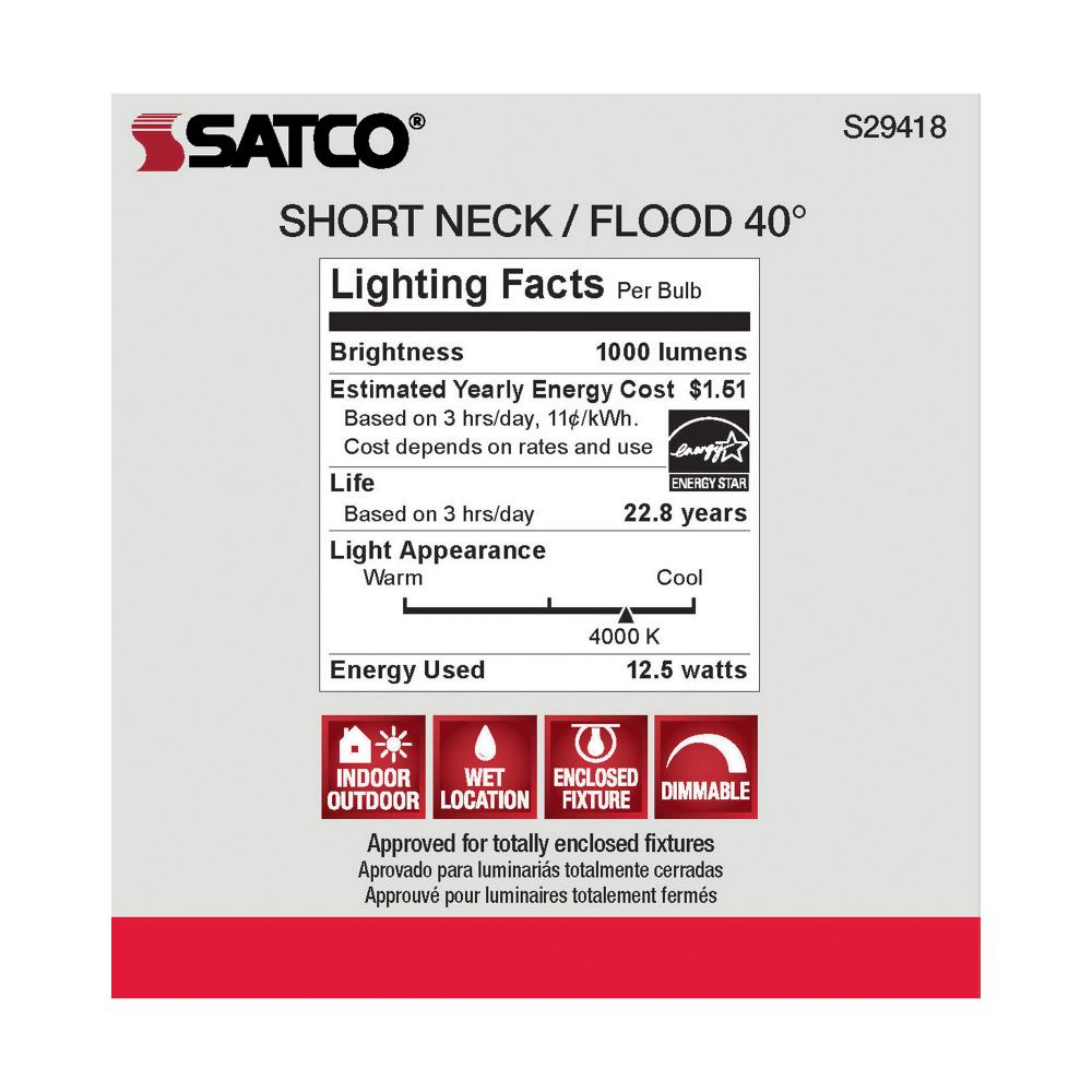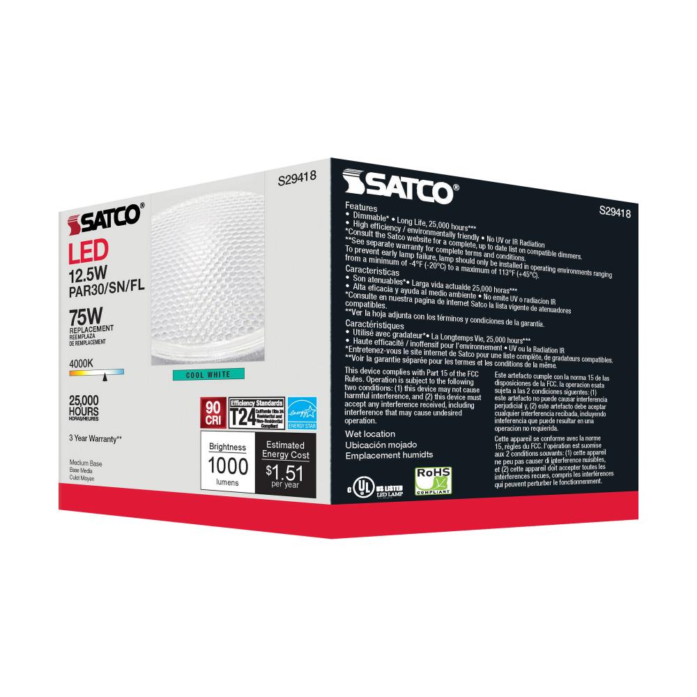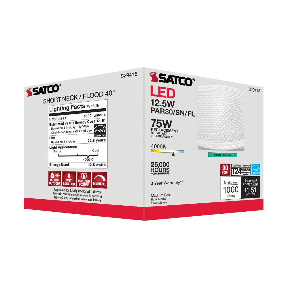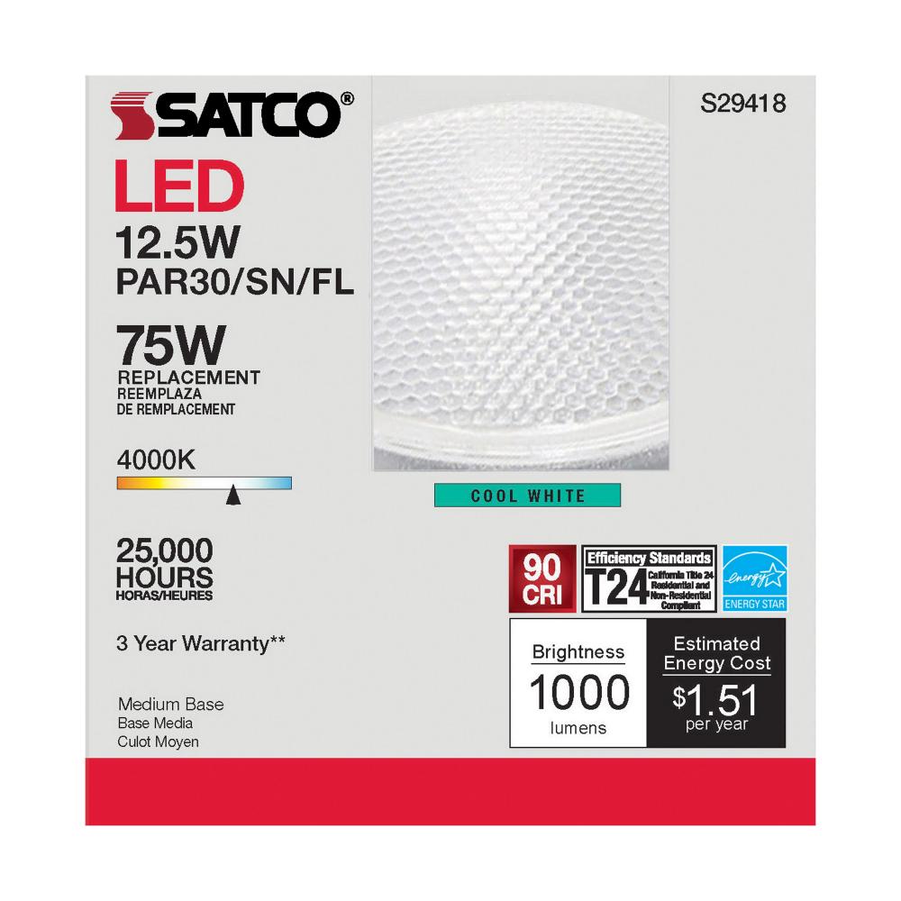 Satco's LED 12.5-watt, PAR30SN lamp maintains the familiar look of the Halogen PAR and Gen1 LED lamps they replace; but at 90 CRI and a higher lumens per watt ratio, it delivers superior light and improved efficiency. Designed for use in track, recesse