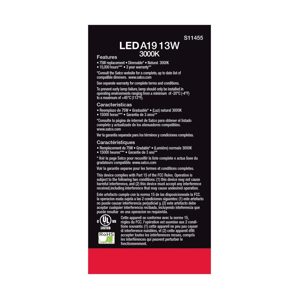 Satco's 13-watt LED lamp is traditional, yet contemporary with its sleek finish and energy saving LED technology. Elegantly illuminate any room in the house with this 4 pack of dimmable bulbs. Sophisticated and modern, this frosted lamp delivers 15,000