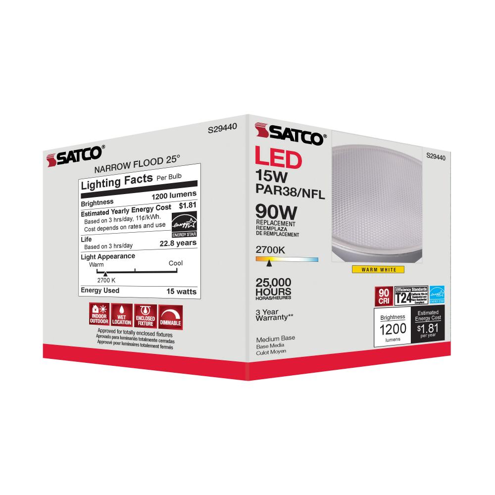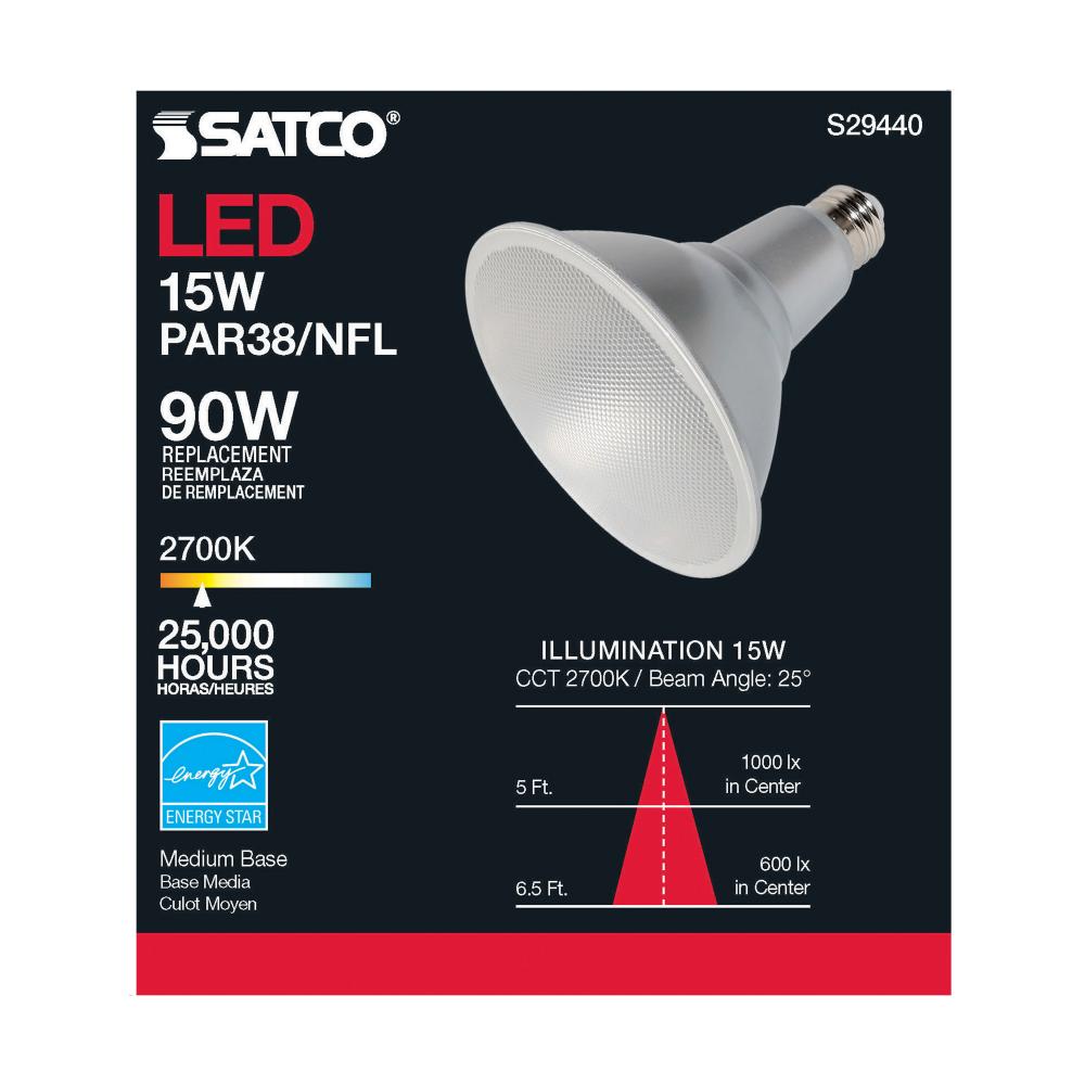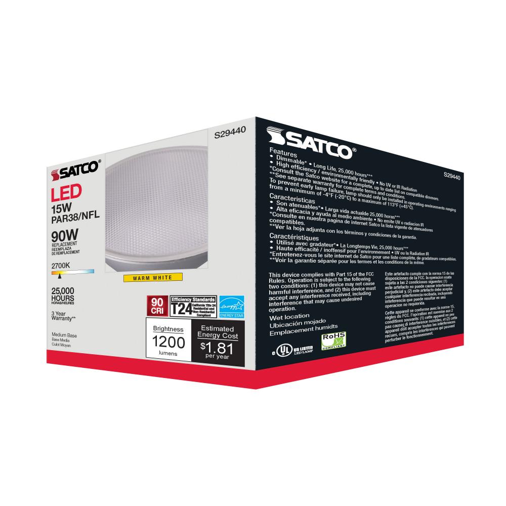 Satco's S29440 LED 15-watt, PAR38 lamp maintains the familiar look of the Halogen PAR and Gen1 LED lamps they replace; but at 90 CRI and a higher lumens per watt ratio, it delivers superior light and improved efficiency. Designed for use in track, rece