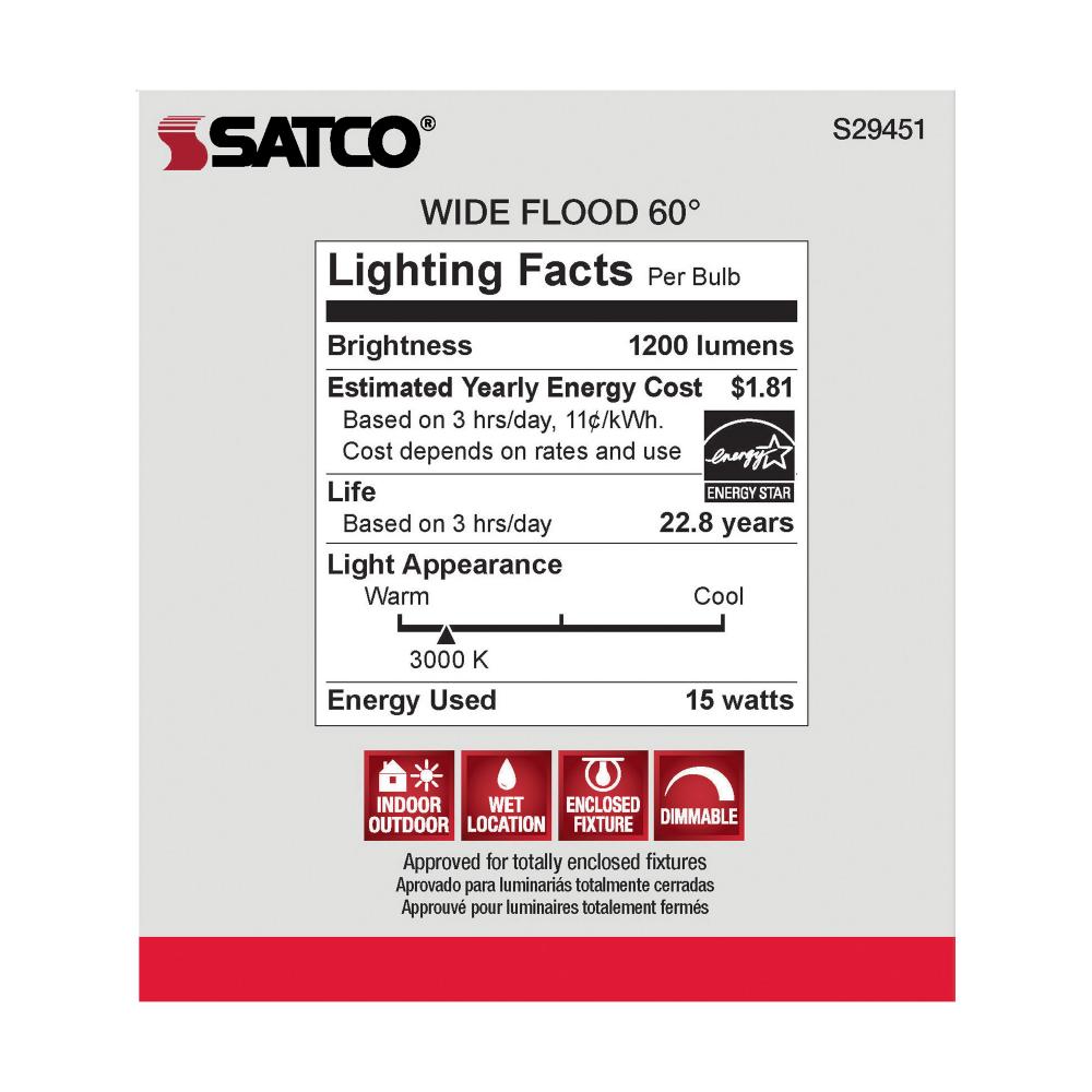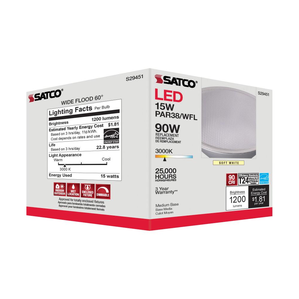 Satco's S29451 LED 15-watt, PAR38 lamp maintains the familiar look of the Halogen PAR and Gen1 LED lamps they replace; but at 90 CRI and a higher lumens per watt ratio, it delivers superior light and improved efficiency. Designed for use in track, rece