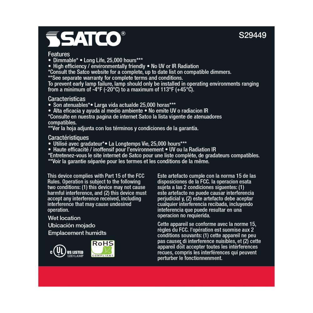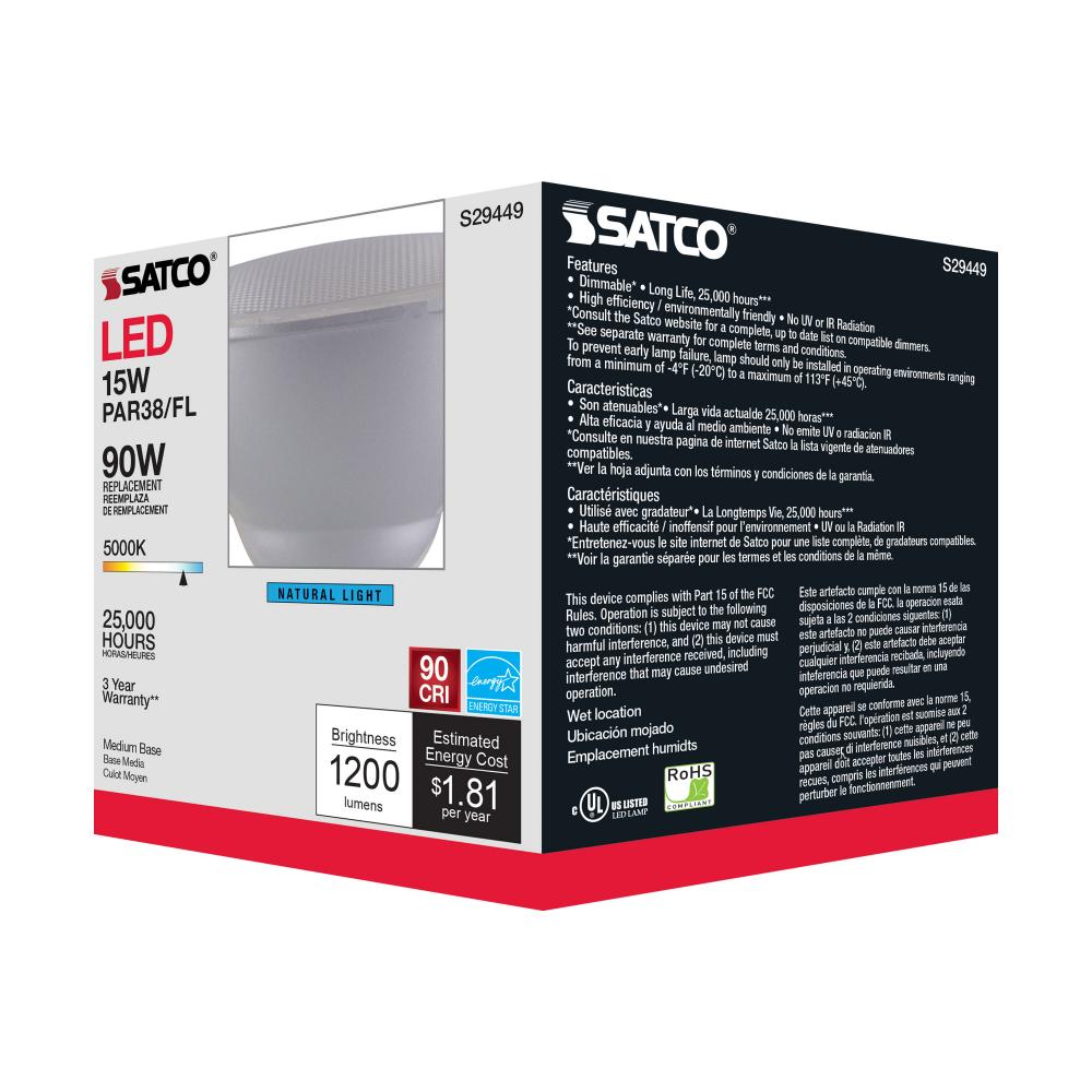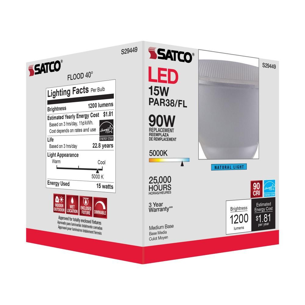 Satco's S29449 LED 15-watt, PAR38 lamp maintains the familiar look of the Halogen PAR and Gen1 LED lamps they replace; but at 90 CRI and a higher lumens per watt ratio, it delivers superior light and improved efficiency. Designed for use in track, rece