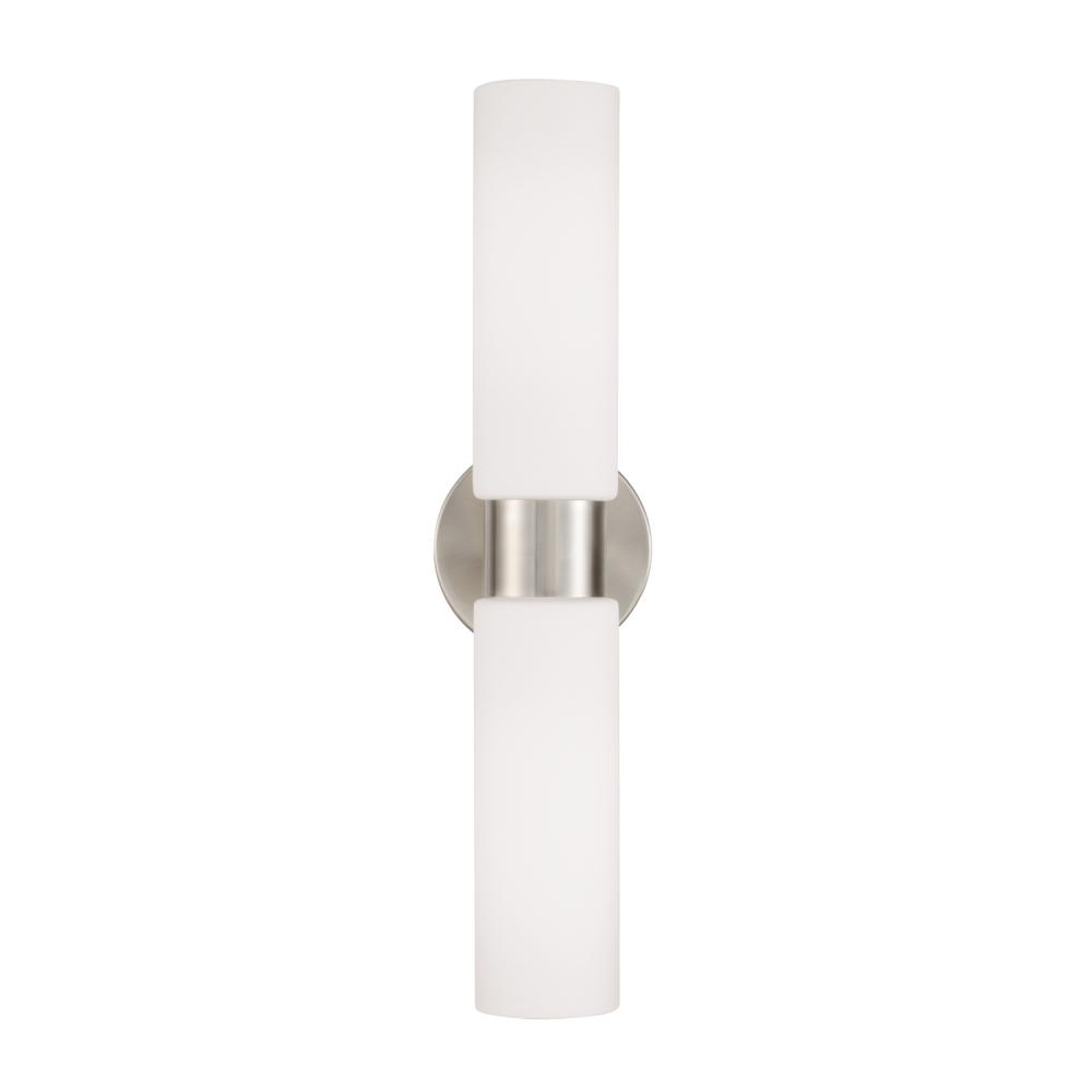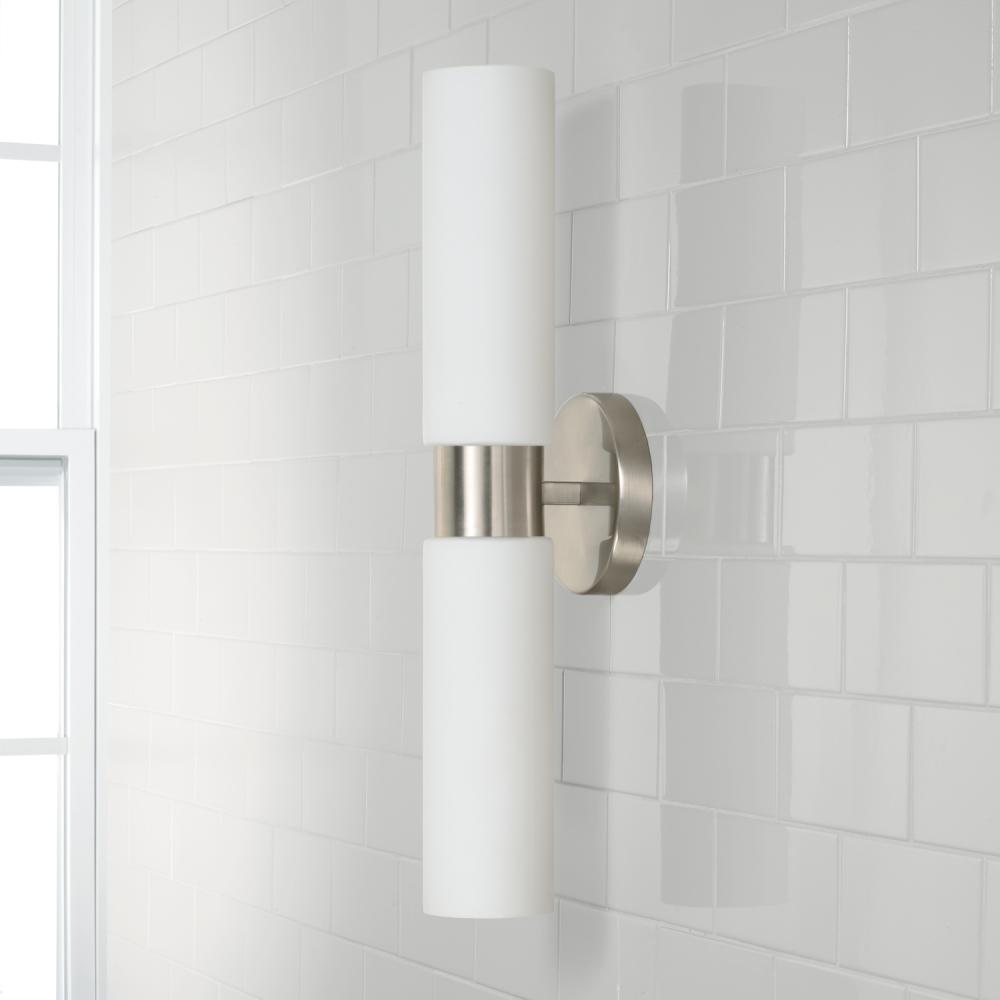 Sleek and classic, the Theo Dual Sconce for HomePlace punctuates any powder room. The Brushed Nickel finish adds a classic touch, while the elongated Soft White glass shades create a sophisticated glow.