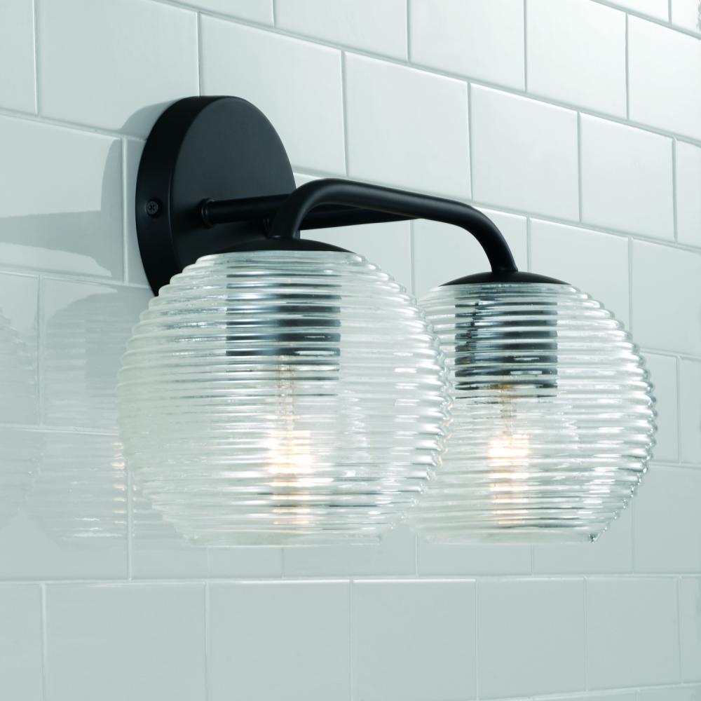 15.5"W x 9.5"H 2-Light Vanity in Matte Black with Clear Ribbed Glass