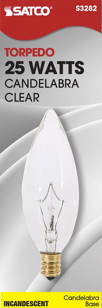 25 Watt BA9 1/2 Incandescent; Clear; 1500 Average rated hours; 212 Lumens; Candelabra base; 120 Volt