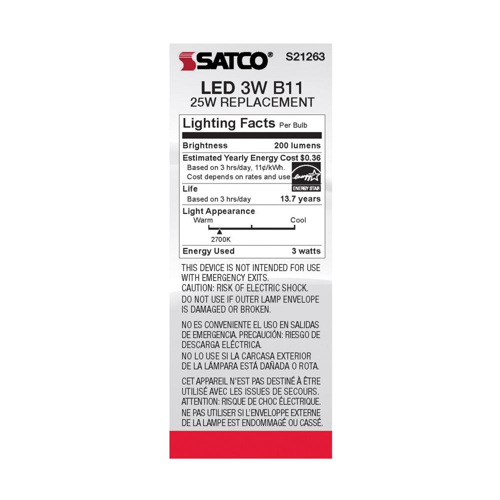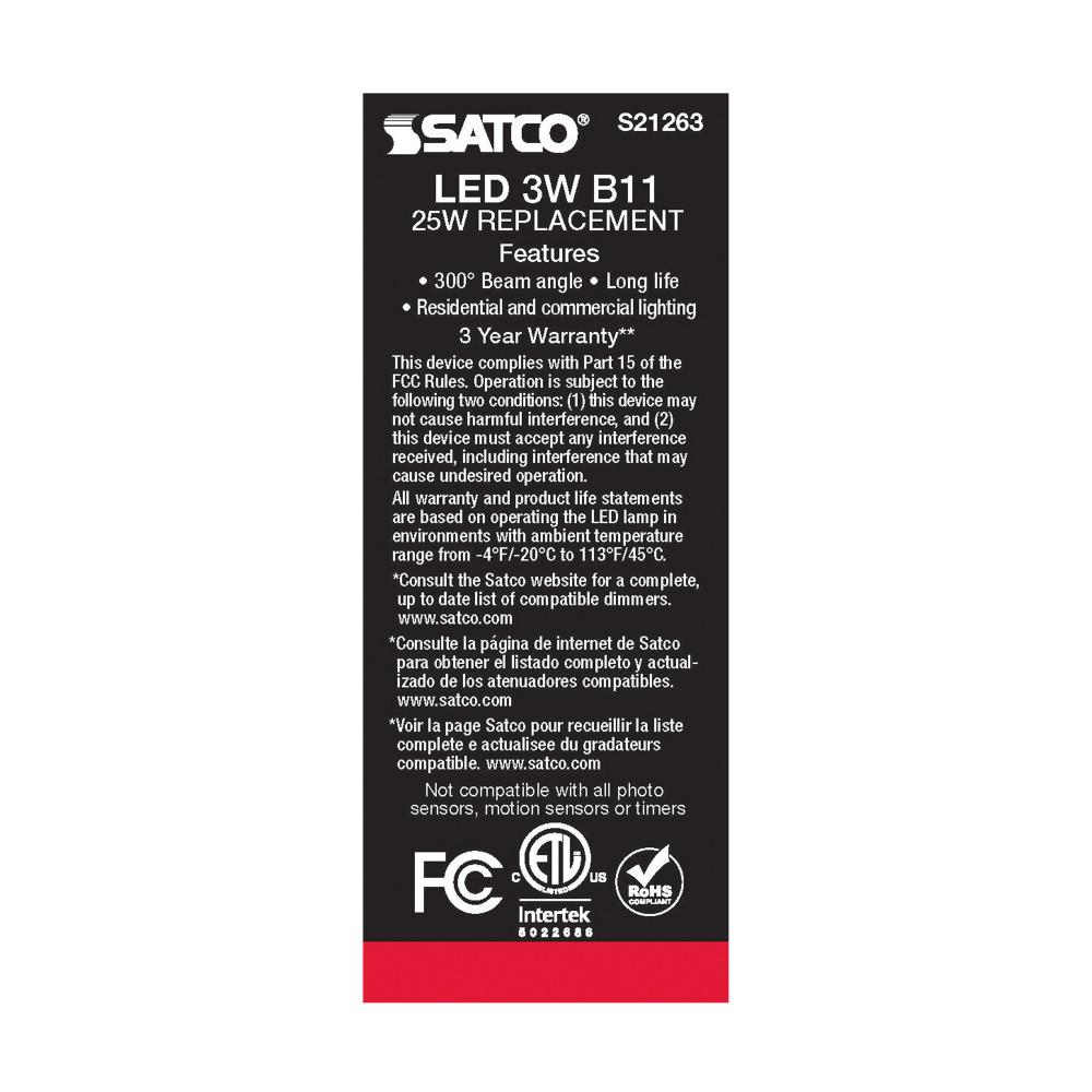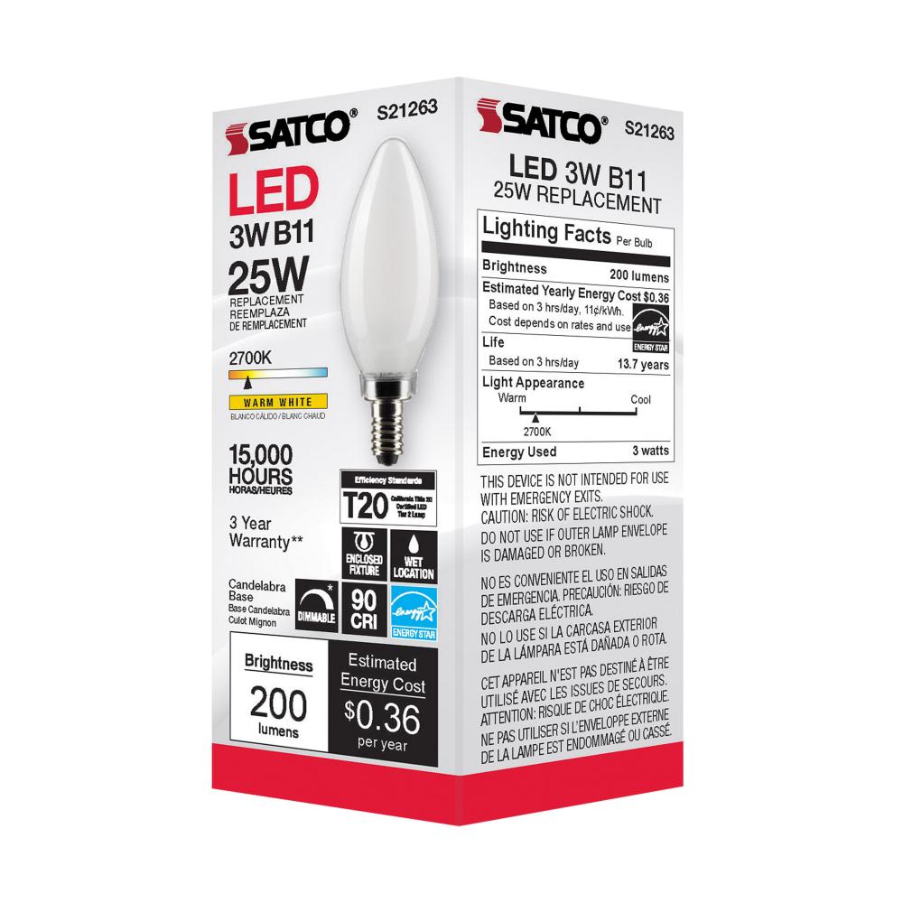 Satco's S21263 3-watt LED lamp is traditional, yet contemporary with its sleek finish and energy saving LED technology. Elegantly illuminate any room in the house with this dimmable, frost finished bulb. Sophisticated and modern, this lamp delivers 15,