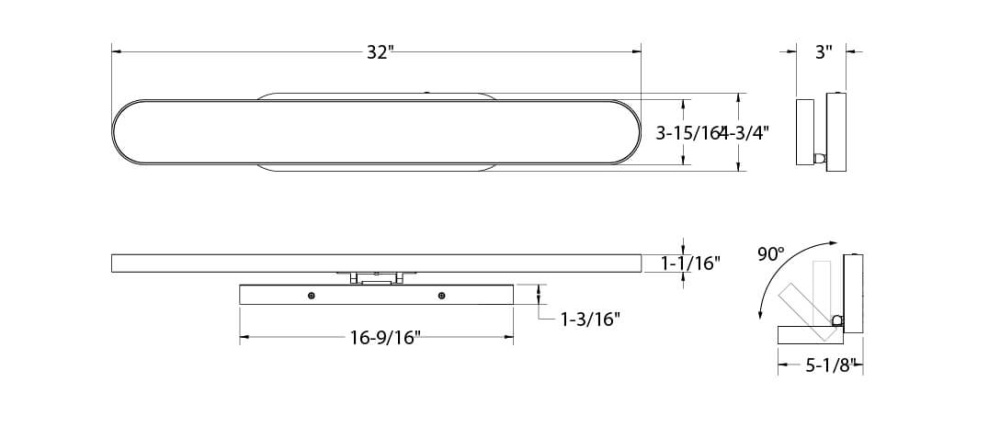 A sleek, high-quality LED profile luminaire with direct light output, crafted from durable aluminum extrusion. Its oblong linear head features an efficient 90° swiveling design for versatile lighting. The fixture can be offset from the electrical box by up to 5-1/2 inches to the left or right, making it easy to align with existing elements such as a sink or mirror.