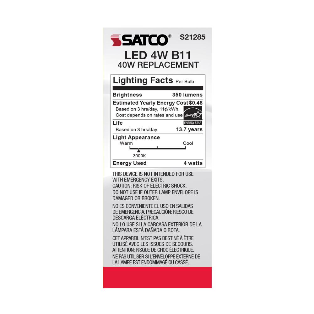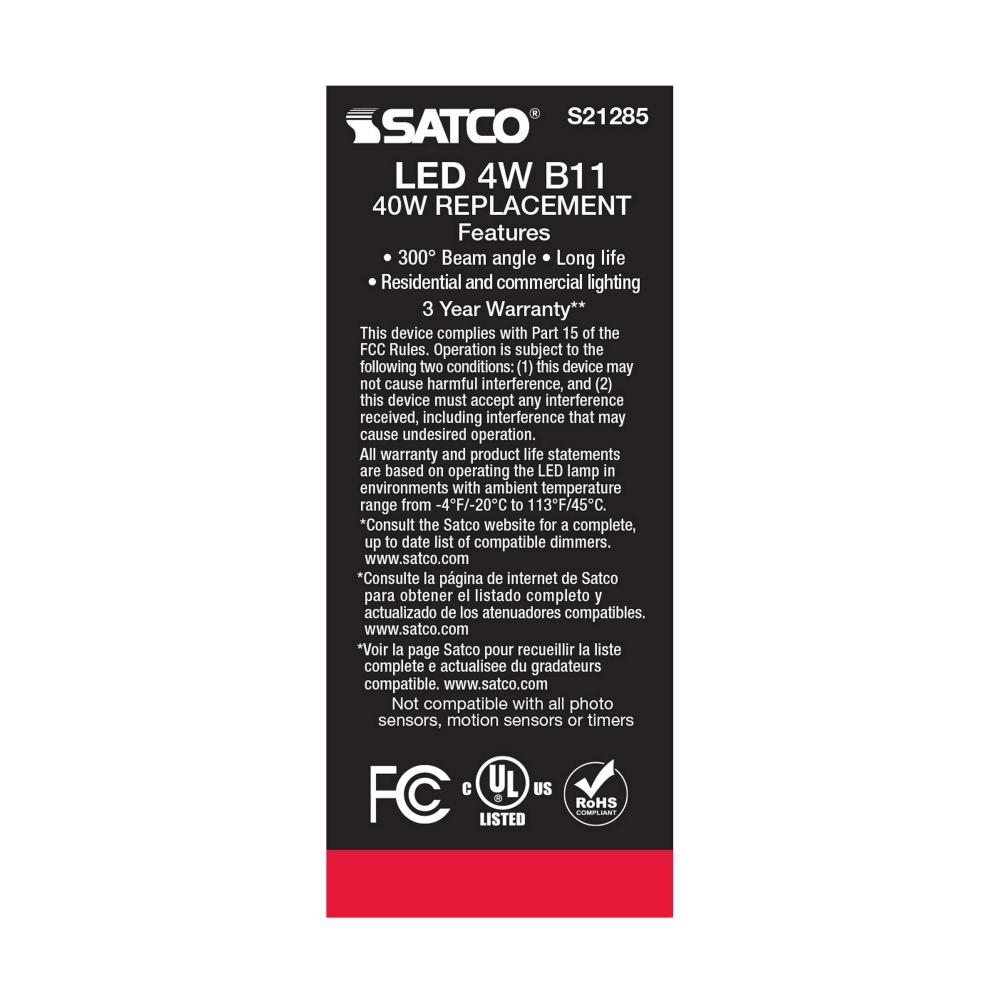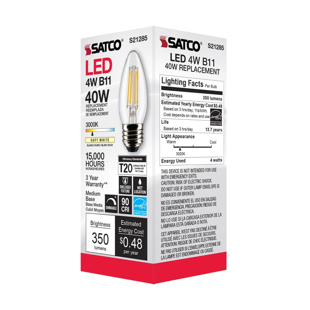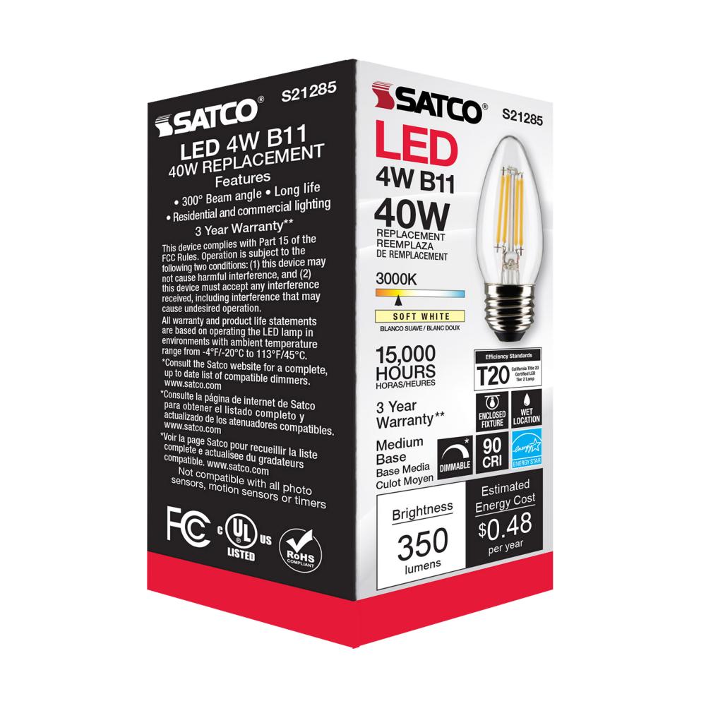 Satco's S21285 4-watt LED lamp is traditional, yet contemporary with its vintage style and energy saving LED technology. Elegantly illuminate any room in the house with this dimmable, clear bulb. Sophisticated and modern, this lamp delivers 15,000 hour
