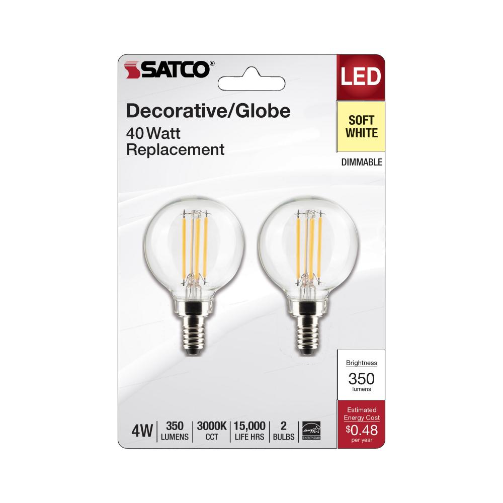 Satco's S21811 4-watt clear, LED G16.5 bulb with a candelabra base is dimmable and offers soft white light and a 300 degree beam spread. Wet rated for kitchens and bathrooms, the carded 2-pack is suitable for retail display. Elegant and long-lasting, t