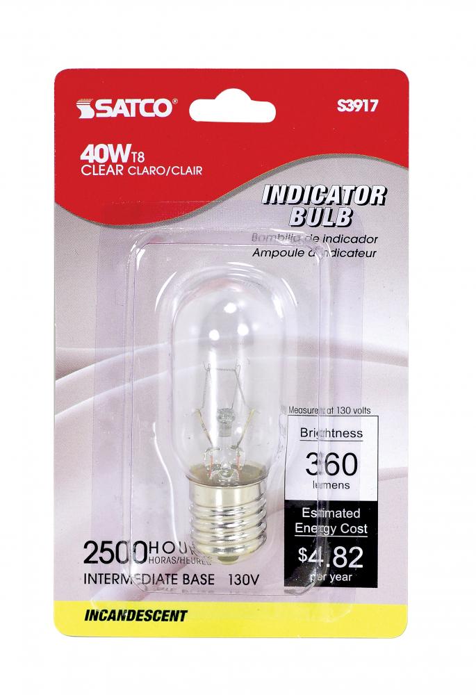 40 Watt T8 Incandescent; Clear; 2000 Average rated hours; 360 Lumens; Intermediate base; 130 Volt; Carded