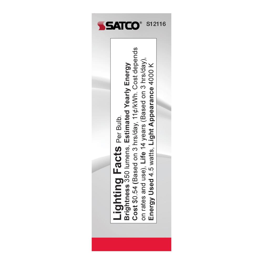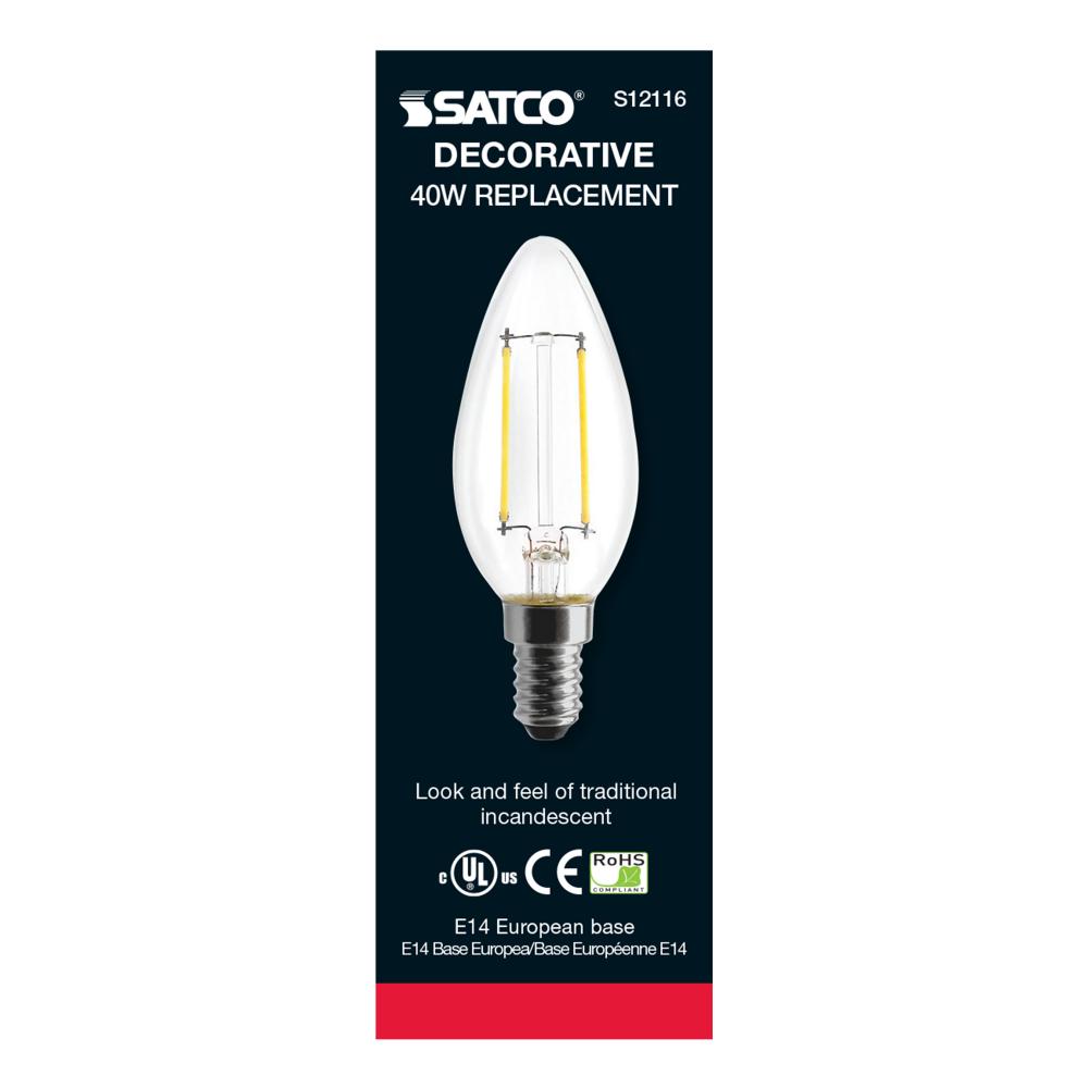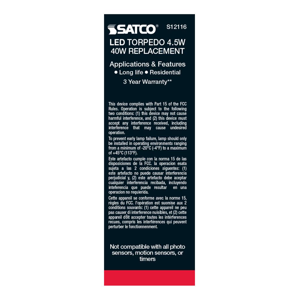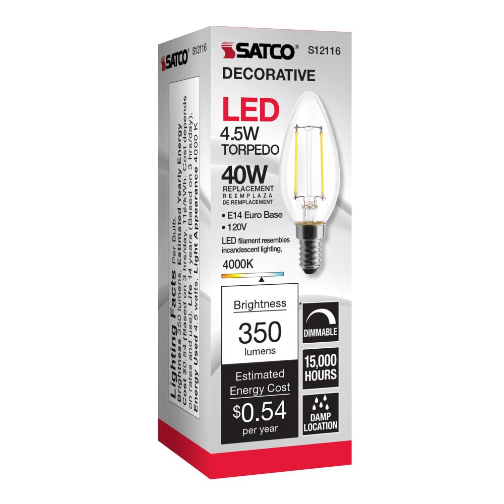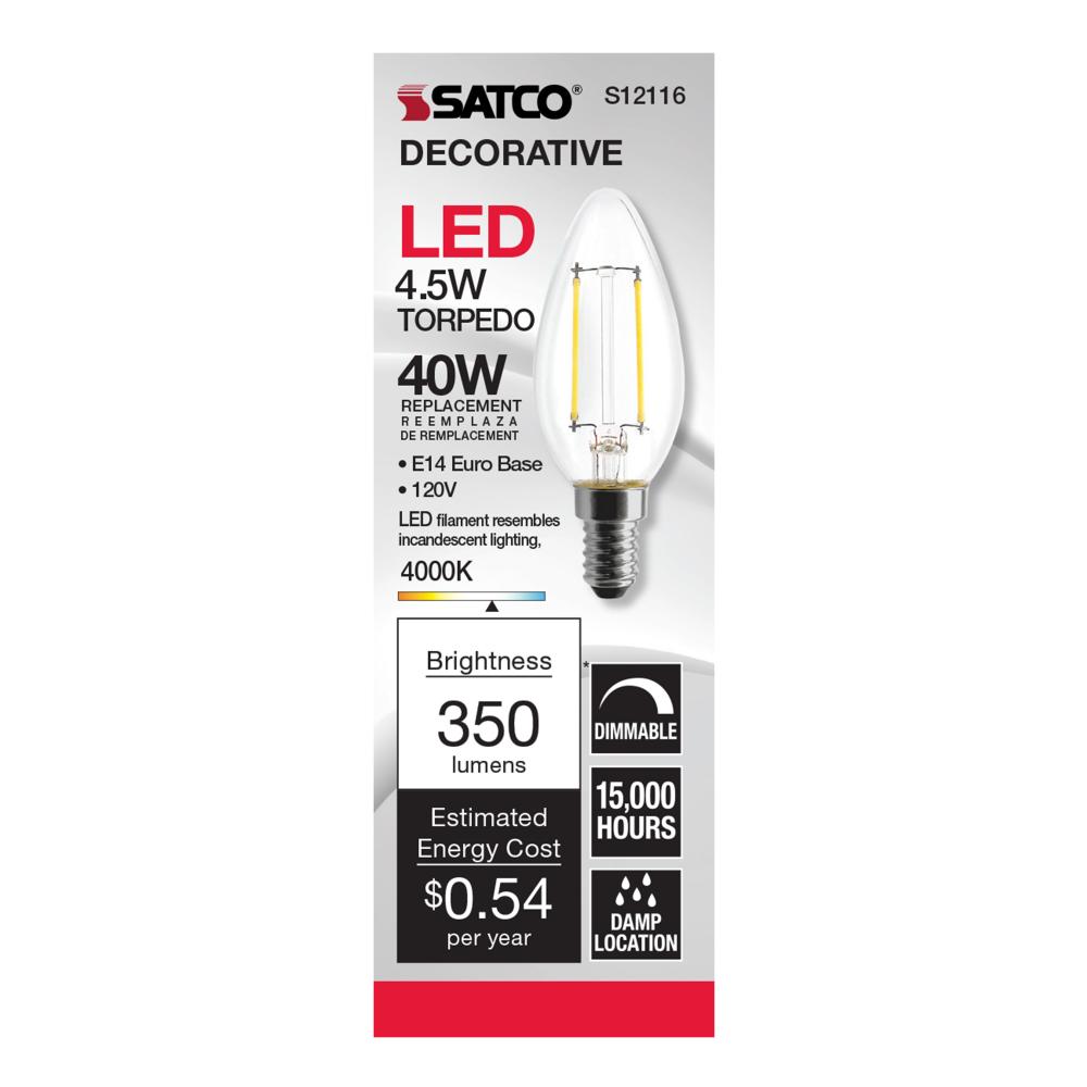 Satco's S12116 is a filament style LED with the look and feel of a traditional incandescent lamp. The torpedo shape lamp has a European E14 base and a color temperature of 4000K. A 4.5-watt LED, but is equivalent to a 40-watt incandescent. Additional f