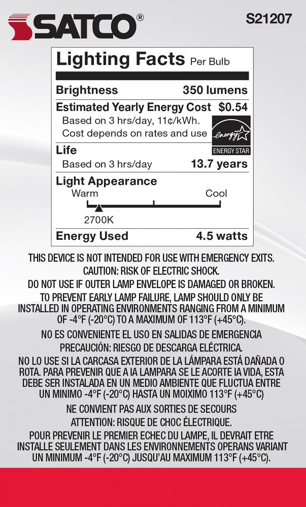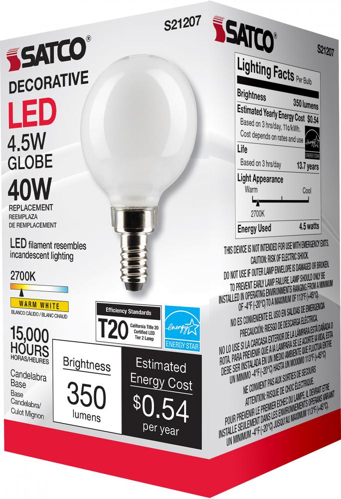 Satco's S21207 4.5-watt LED lamp is traditional, yet contemporary with its sleek finish and energy saving LED technology. Elegantly illuminate any room in the house with this dimmable, globe shaped bulb. Sophisticated and modern, this lamp delivers 15,