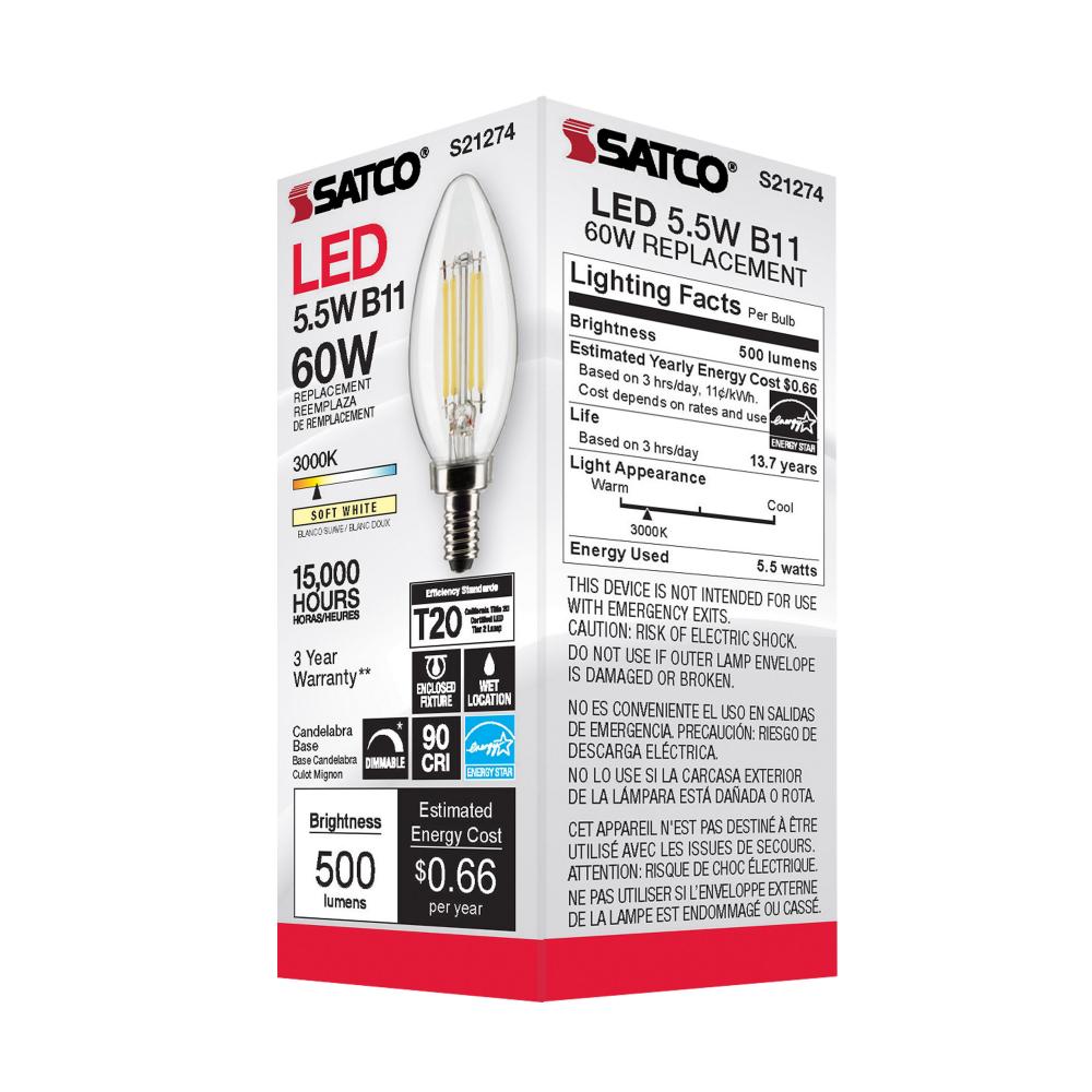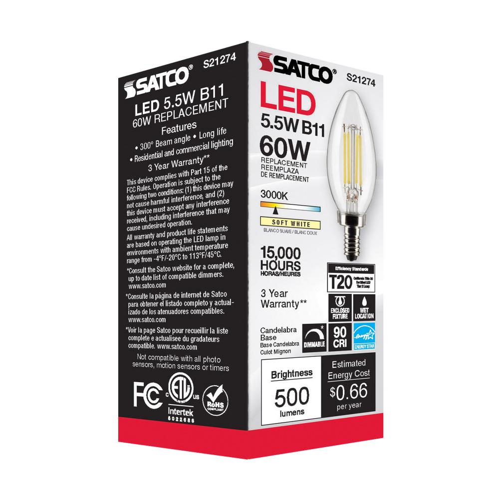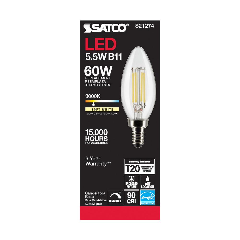 Satco's S21274 5.5-watt LED lamp is traditional, yet contemporary with its vintage style and energy saving LED technology. Elegantly illuminate any room in the house with this dimmable, clear bulb. Sophisticated and modern, this lamp delivers 15,000 ho