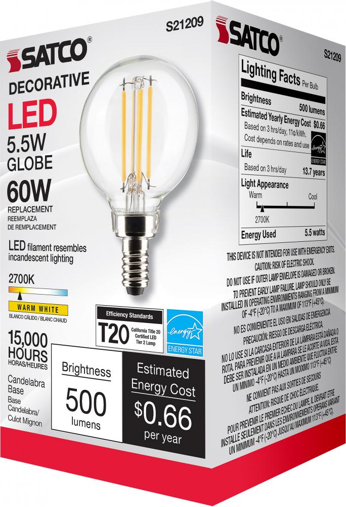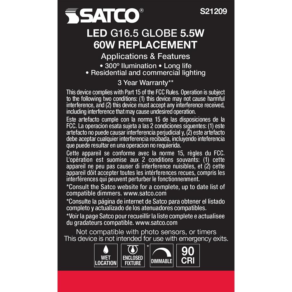 Satco's S21209 5.5-watt LED lamp is traditional, yet contemporary with its vintage style and energy saving LED technology. Elegantly illuminate any room in the house with this dimmable, globe shaped bulb. Sophisticated and modern, this lamp delivers 15