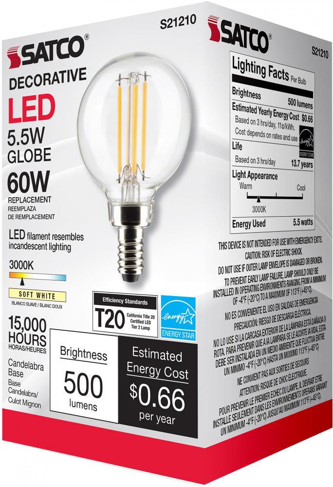 Satco's 5.5-watt LED lamp is traditional, yet contemporary with its vintage style and energy saving LED technology. Elegantly illuminate any room in the house with this dimmable, globe shaped bulb. Sophisticated and modern, this lamp delivers 15,000 ho