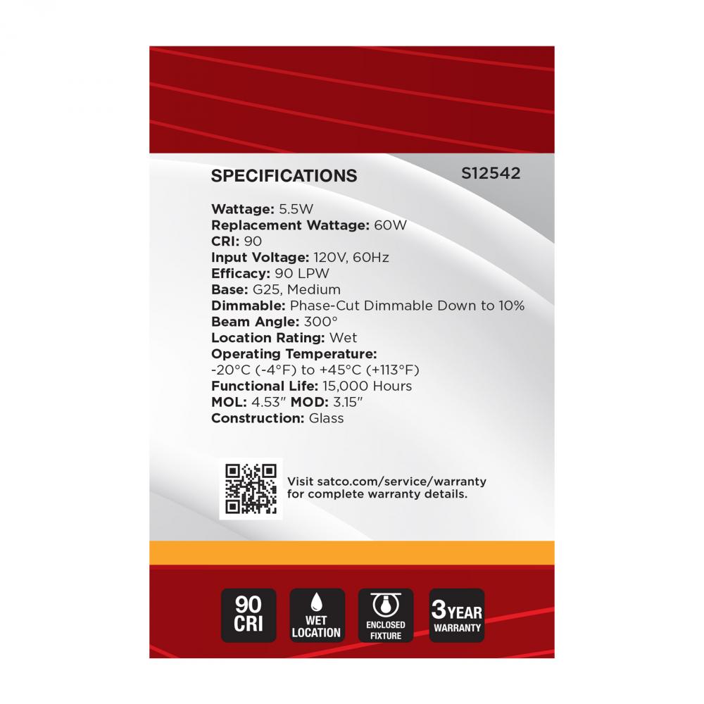 5.5 Watt G25 LED; Medium Base; 2700K CCT; Gold Crown; 60 Watt Replacement