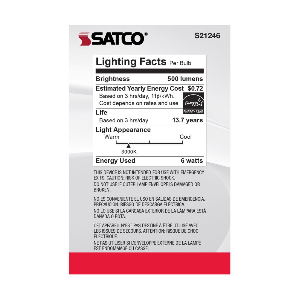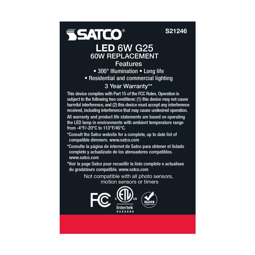 Satco's S21246 6-watt LED lamp is traditional, yet contemporary with its vintage style and energy saving LED technology. Elegantly illuminate any room in the house with this dimmable, globe shaped bulb. Sophisticated and modern, this lamp delivers 15,0