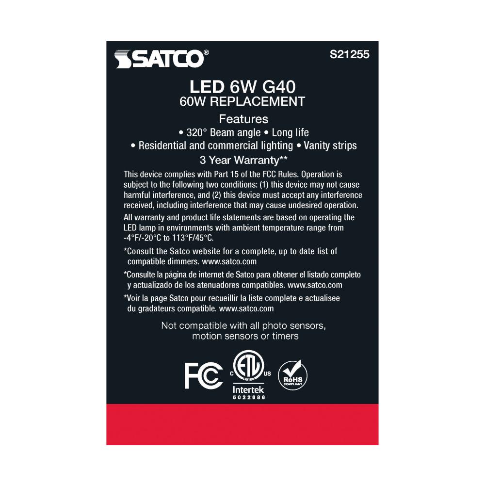 Satco's S21255 6-watt LED lamp is traditional, yet contemporary with its sleek finish and energy saving LED technology. Elegantly illuminate any room in the house with this dimmable, globe shaped bulb. Sophisticated and modern, this lamp delivers 15,00