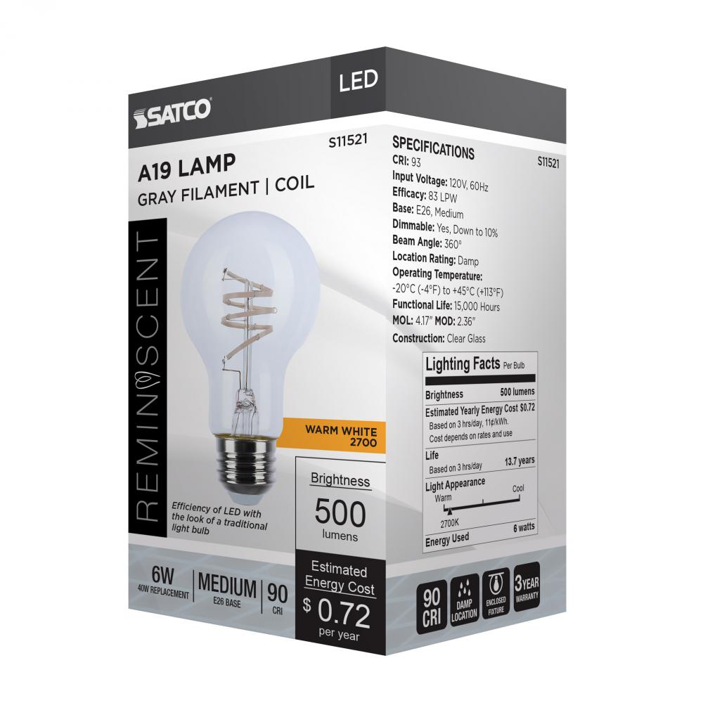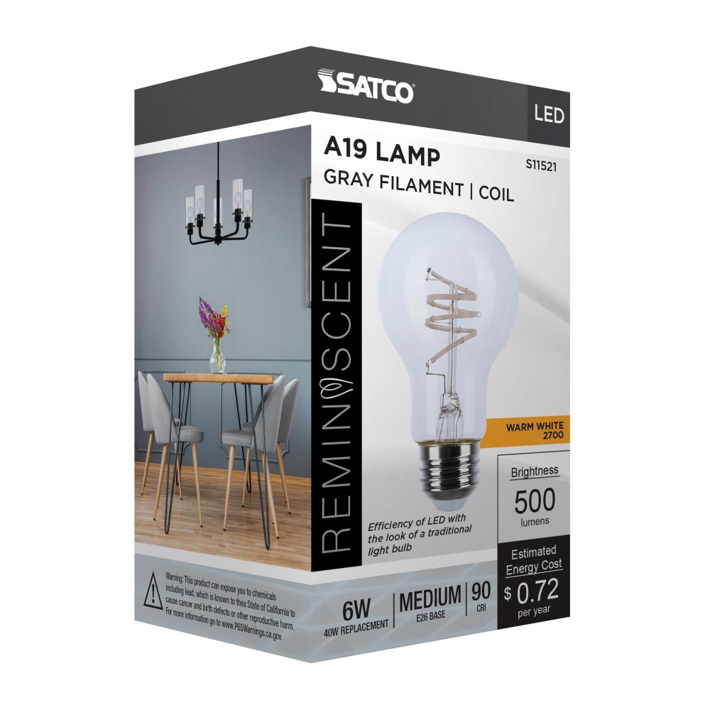 SATCO NUVO's S11521 A19 Reminiscent lamp offers the traditional look of tungsten filament bulbs with the energy savings of LED technology. The gray coil filaments provide a clean aesthetic, blending in with many current fixture and decor trends. With b
