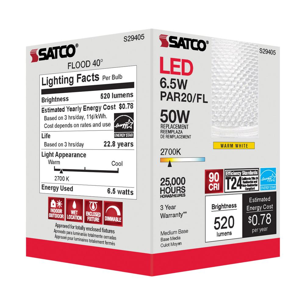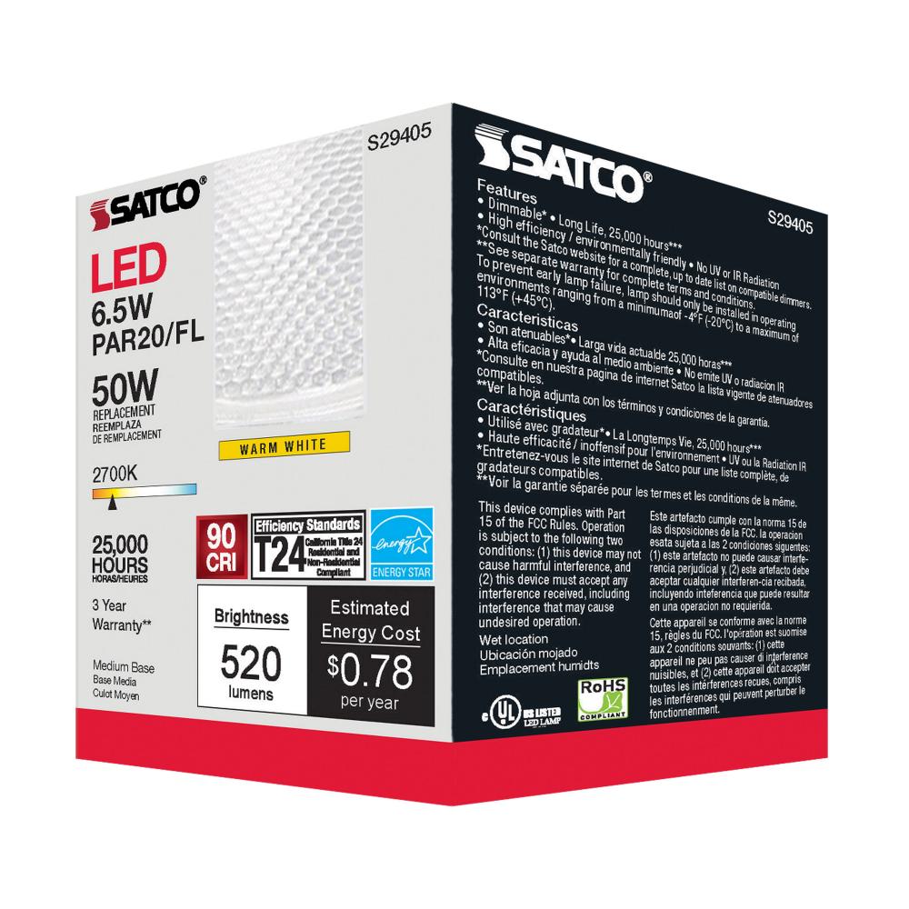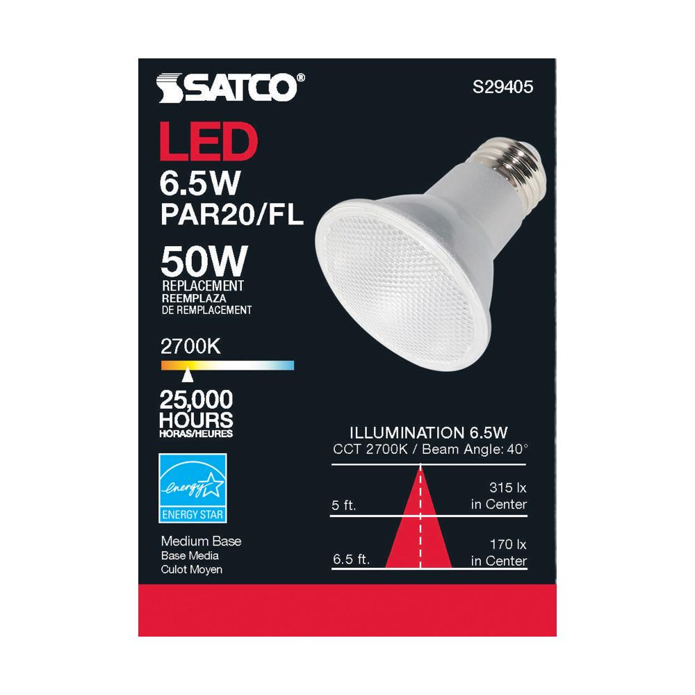 Satco's S29405 LED 6.5-watt, PAR20 lamp maintains the familiar look of the Halogen PAR and Gen1 LED lamps they replace; but at 90 CRI and a higher lumens per watt ratio, it delivers superior light and improved efficiency. Designed for use in track, rec