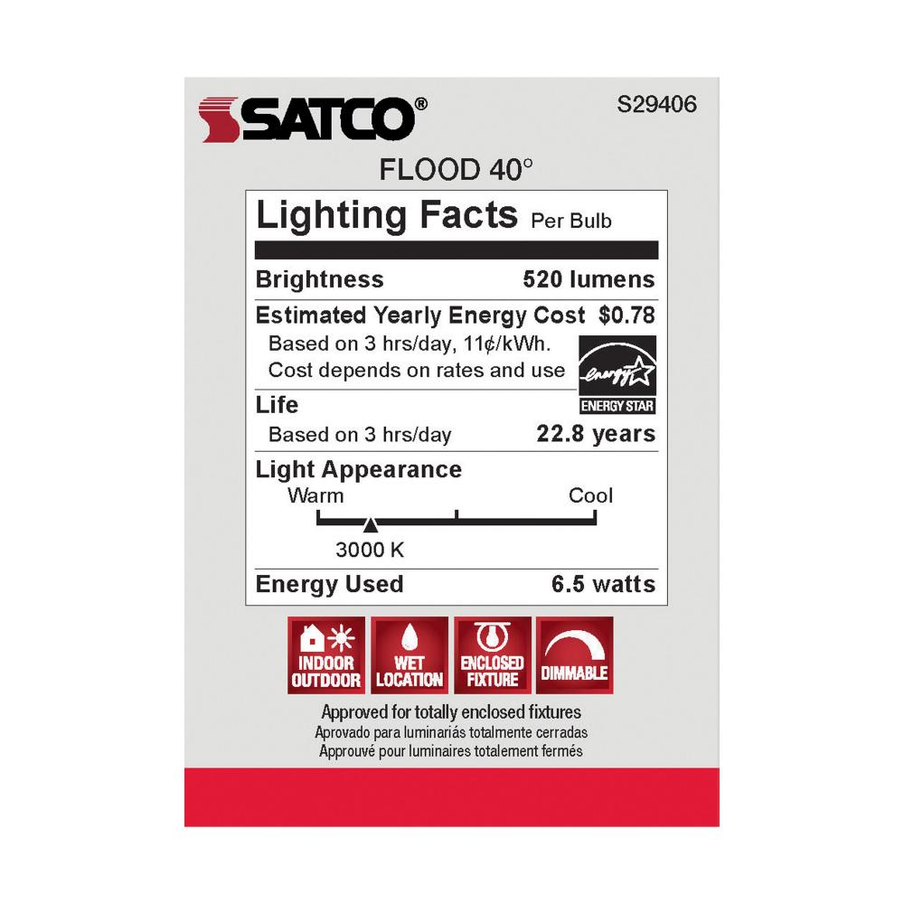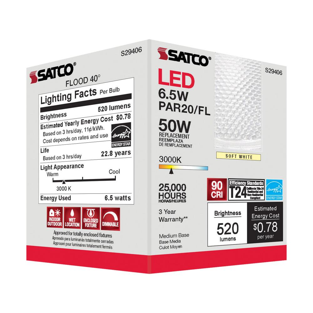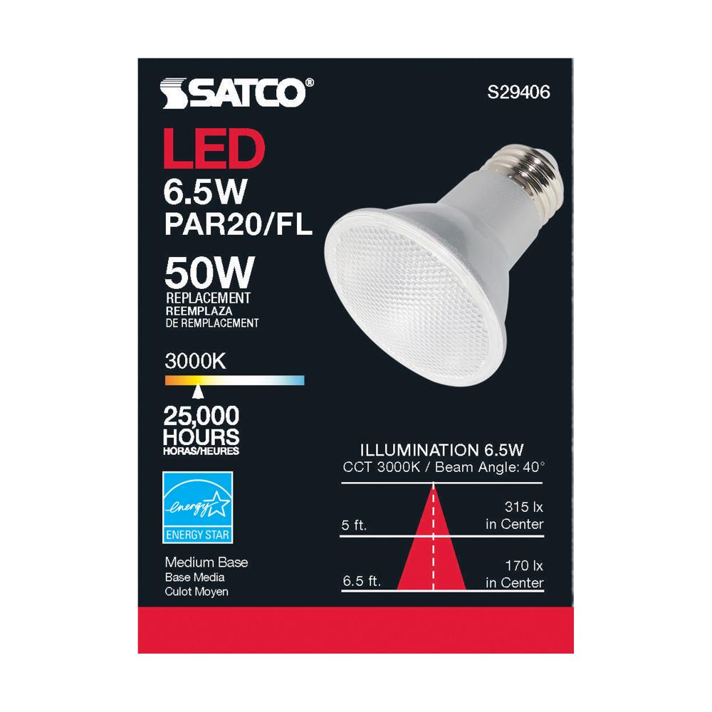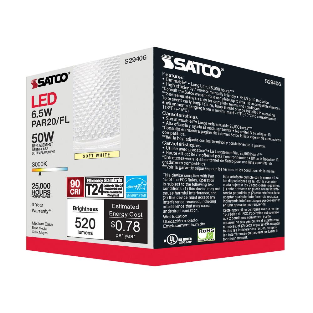 Satco's S29406 LED 6.5-watt, PAR20 lamp maintains the familiar look of the Halogen PAR and Gen1 LED lamps they replace; but at 90 CRI and a higher lumens per watt ratio, it delivers superior light and improved efficiency. Designed for use in track, rec