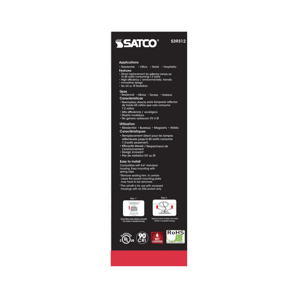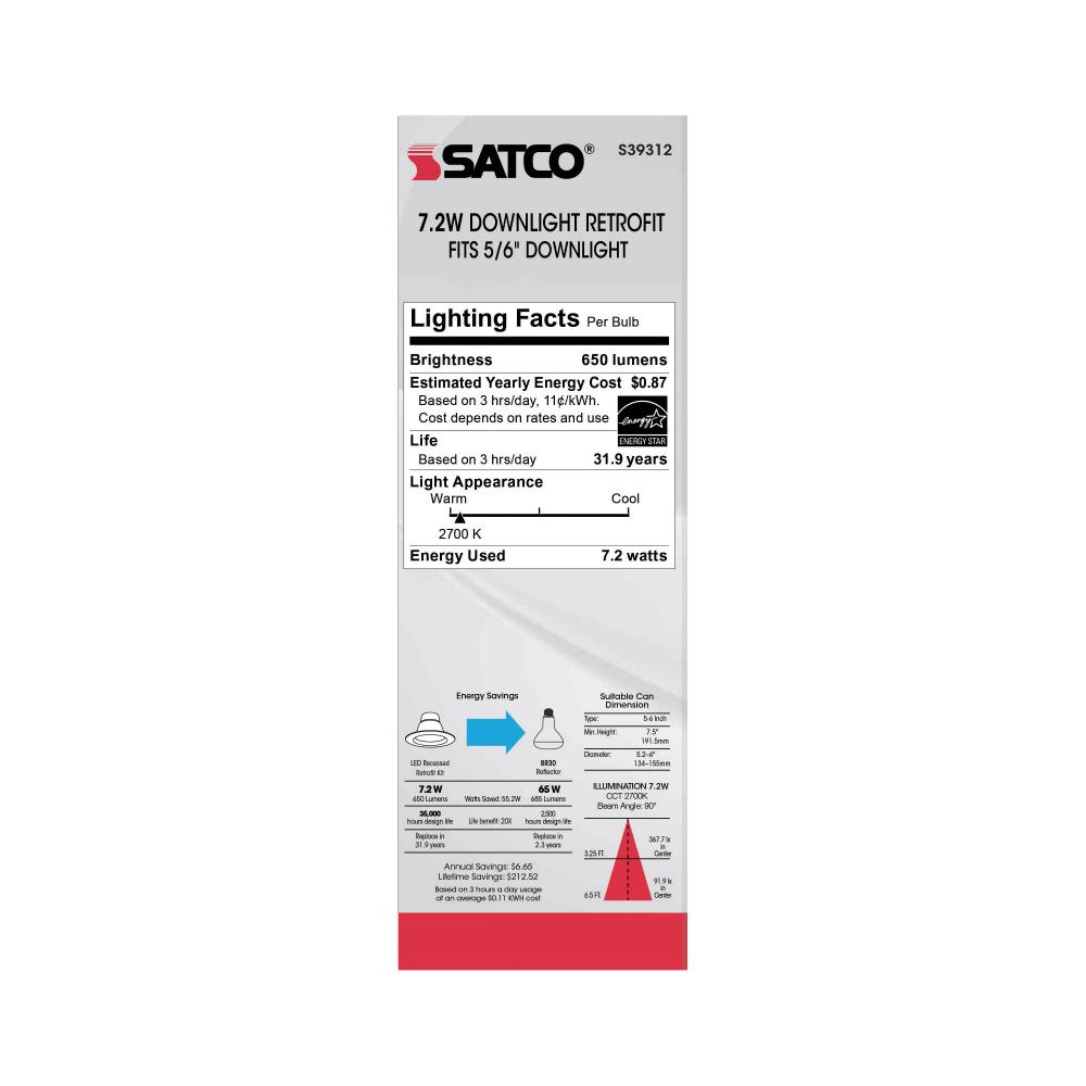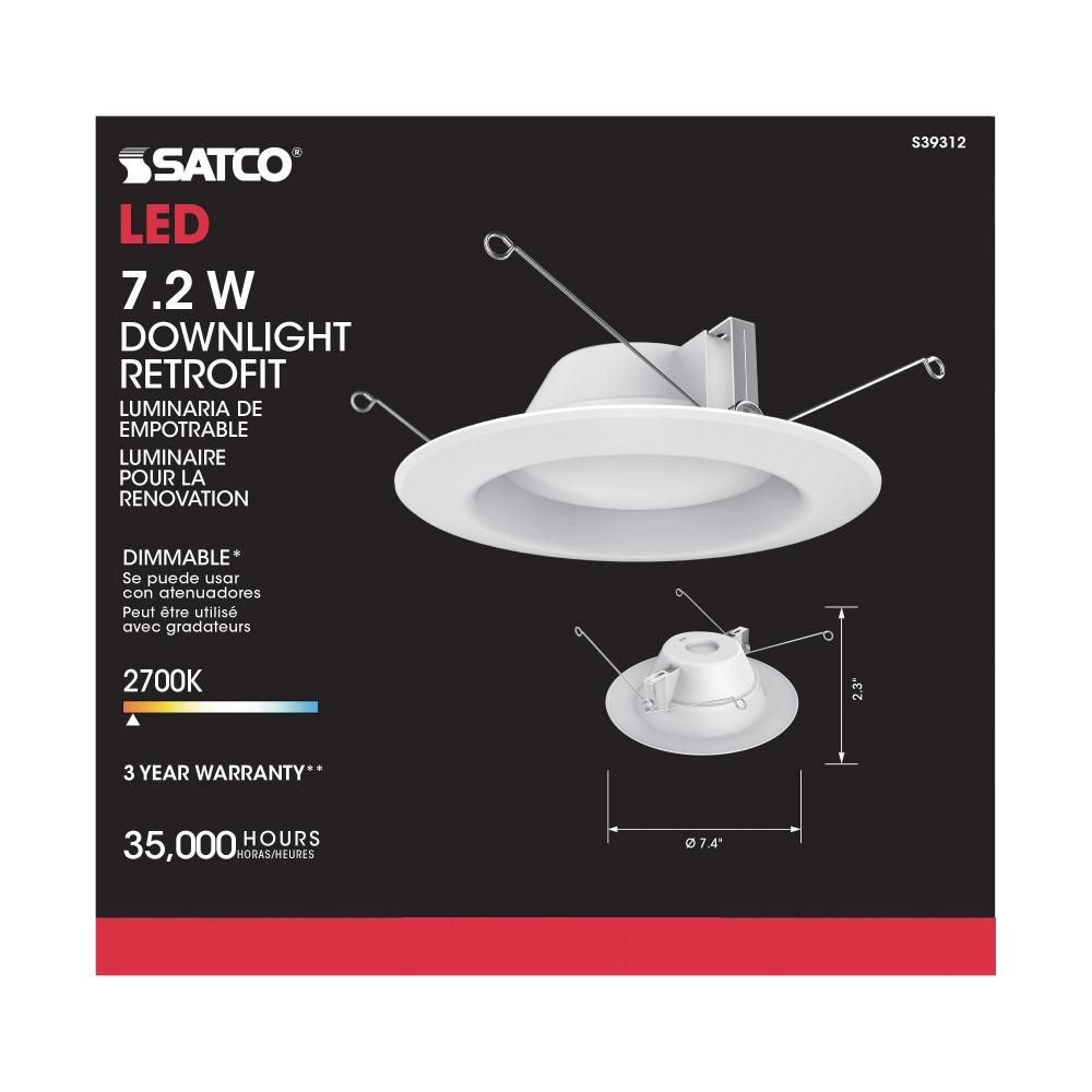 Elevate your lighting with SATCO NUVO's S39312 LED Retrofit Downlight, designed with impeccable color rendering. This retrofit is 7.2-watts with a beam spread of 90 degrees and a color rendering temperature of 2700K, making it the perfect upgrade for e