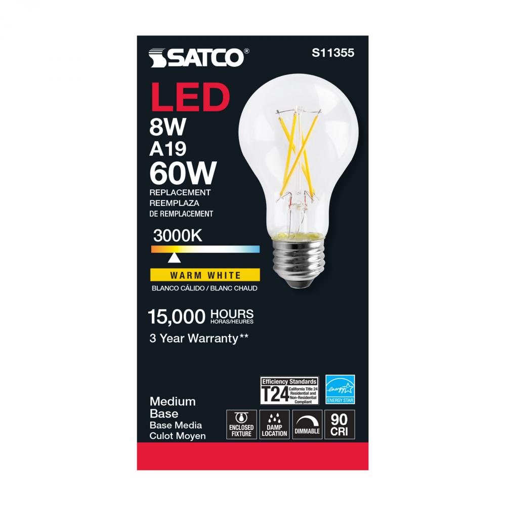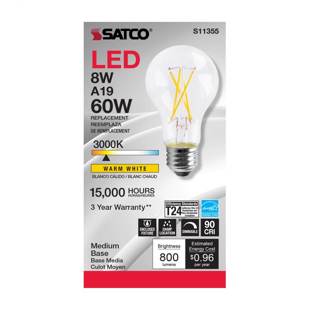 Satco's S11355 8-watt LED bulb is an elegant and traditional lighting solution for the home. Illuminate dining rooms, living rooms, and office spaces with this dimmable, clear bulb. Featuring a beam spread of 320 degrees, this bulb delivers 15,000 hour