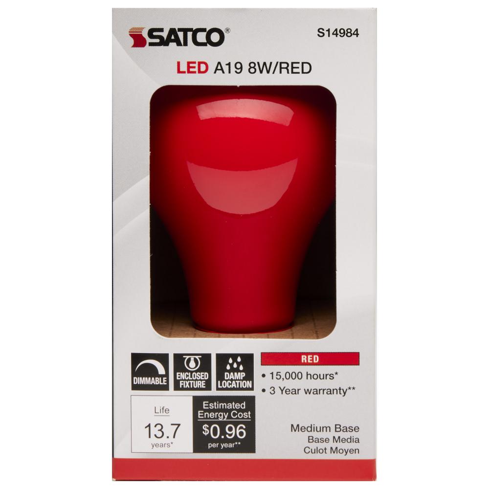 Satco's S14984 8 watt A19 ceramic LED bulb is perfect for decorative lighting, holidays, support and celebratory lighting. The ceramic red bulb features a medium base and a 360 degree beam spread. The dimmable lamp provides 15,000 hours of LED lighting