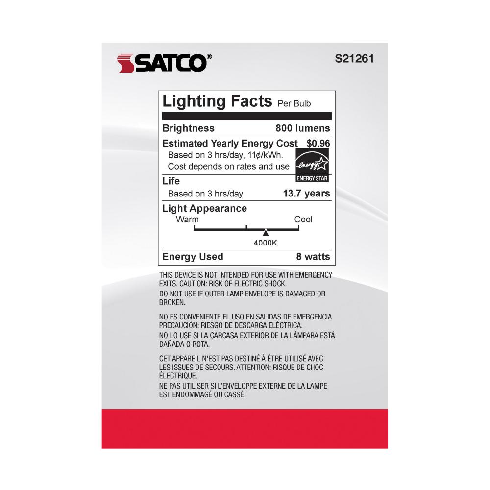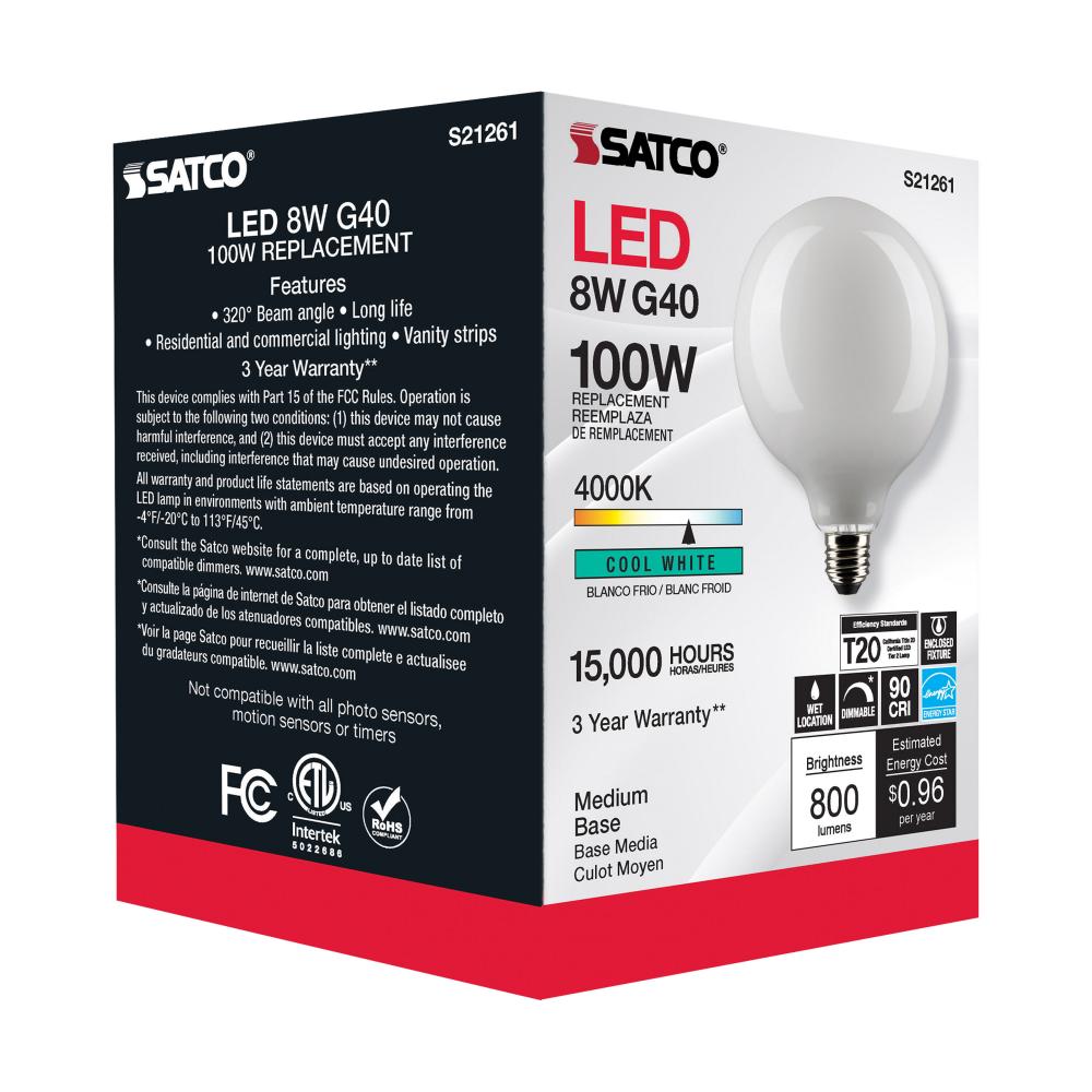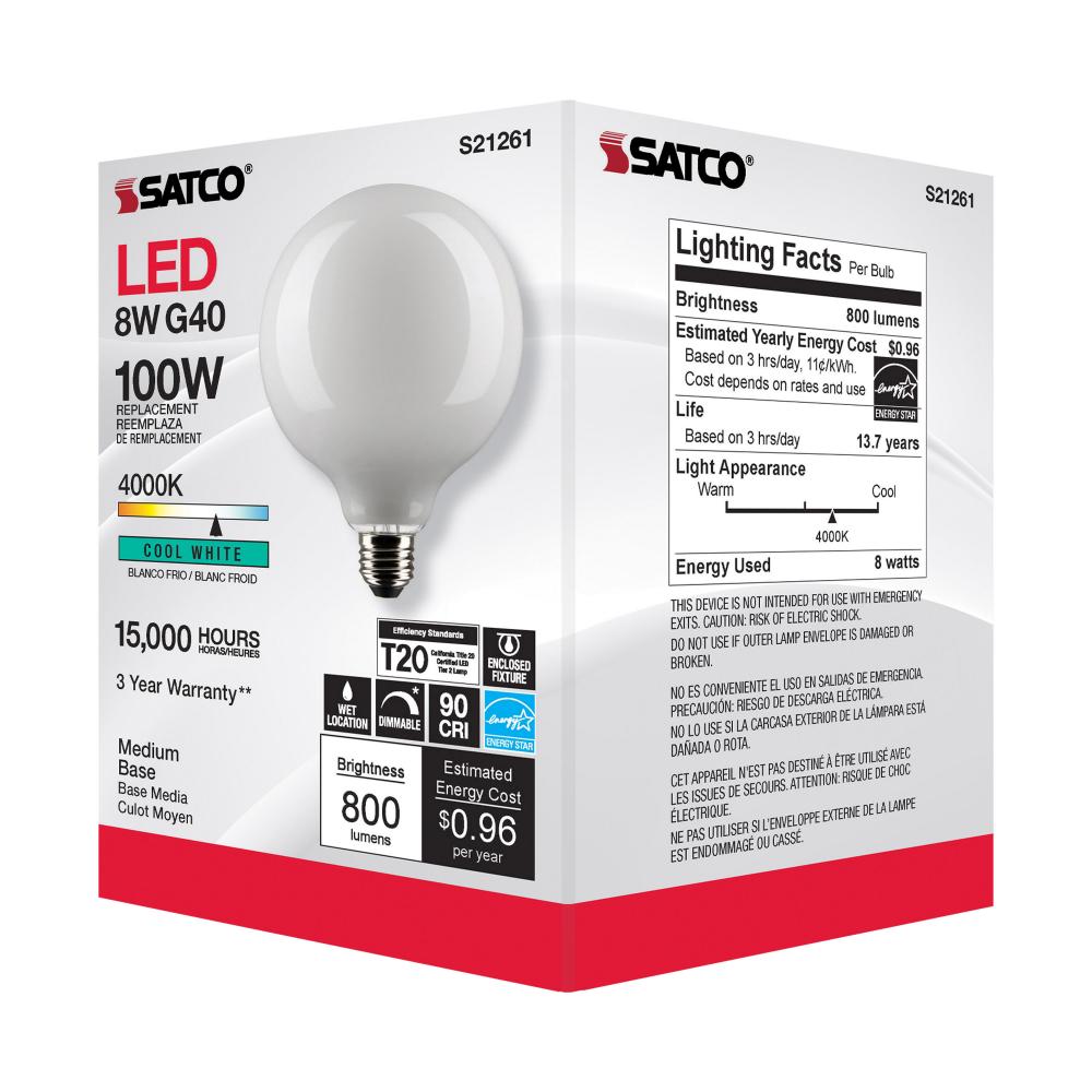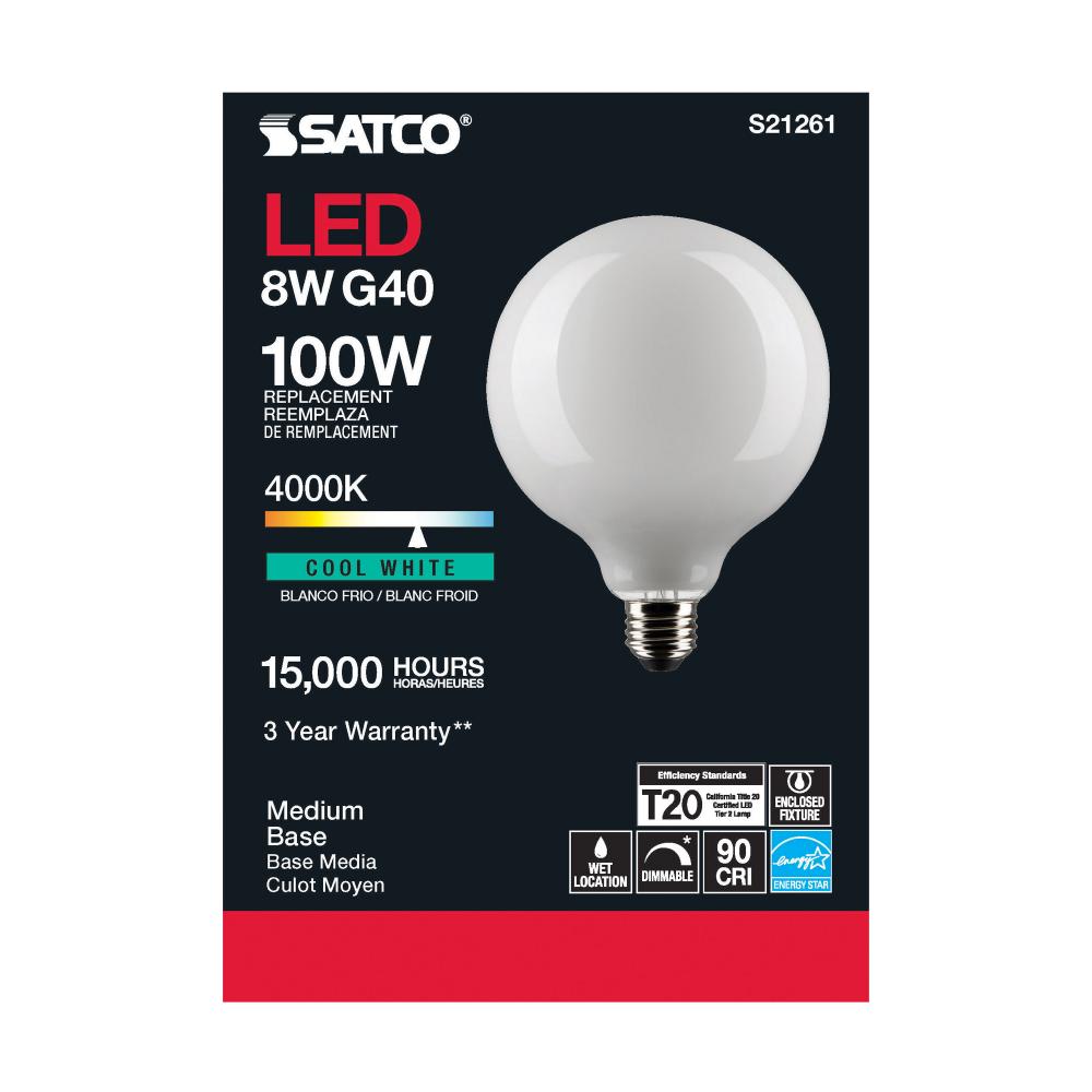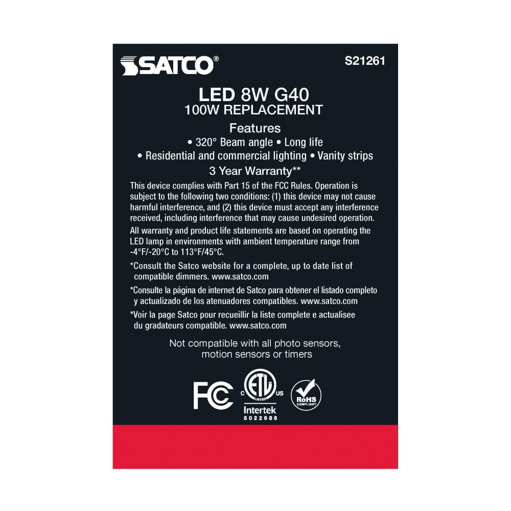 Satco's S21261 8-watt LED lamp is traditional, yet contemporary with its sleek finish and energy saving LED technology. Elegantly illuminate any room in the house with this dimmable, globe shaped bulb. Sophisticated and modern, this lamp delivers 15,00