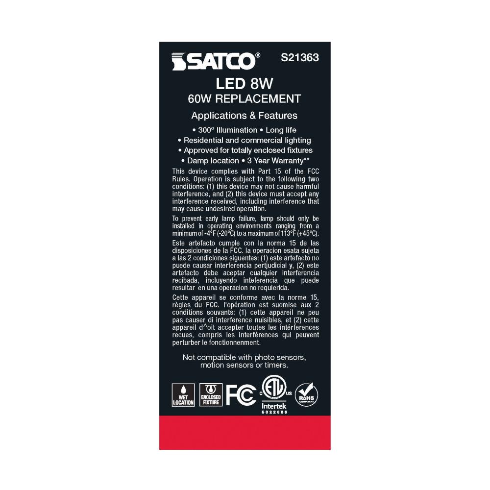 Satco's S21363 8-watt, LED lamp is traditional, yet contemporary with its vintage style and energy saving LED technology. Elegantly illuminate any room in the house with this dimmable, clear bulb. Sophisticated and modern, this lamp delivers 15,000 hou