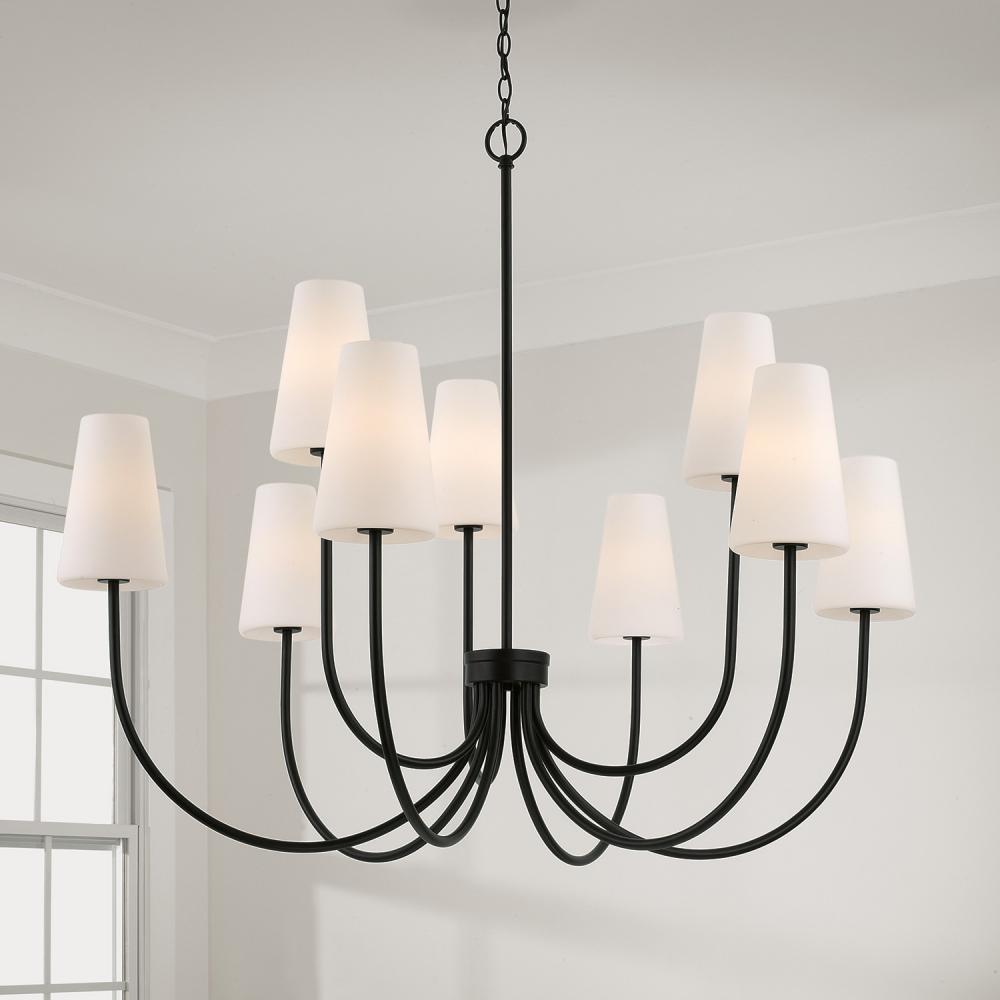 Classic curves and grand scale create the Averitt Grand Two-Tier Chandelier. The elongated Soft White glass tapered shades complement the sleek arms for elegant transitional style, while the Matte Black finish creates sophisticated contrast.