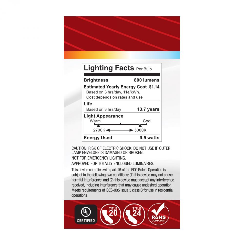 Upgrade your lighting with SATCO NUVO's high-performance 9.5-watt LED A19 bulb (S12143), designed for exceptional versatility and energy savings. This E26 base bulb features 5 CCT selectable technology (2700K–5000K) and a high 90 CRI for vibrant, tru