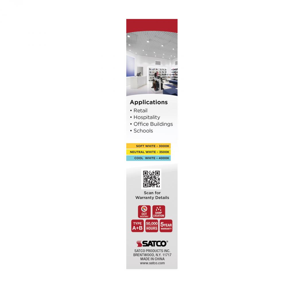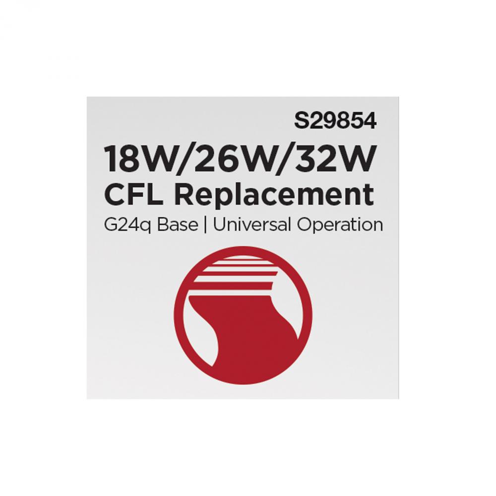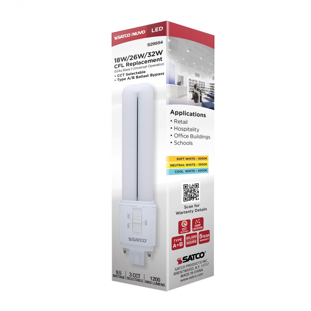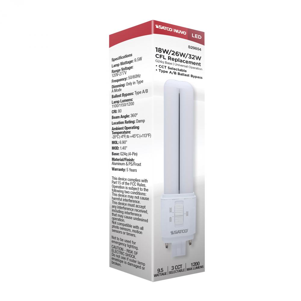 SATCO NUVO's S29854 9.5-watt PL lamp offers a versatile replacement for traditional 18W, 26W, and 32W CFL lamps. Designed with a G24q (4-pin) base, it supports both Type A and Type B ballast bypass operation, making it ideal for retrofitting without re