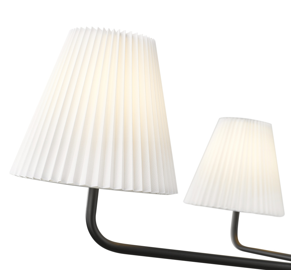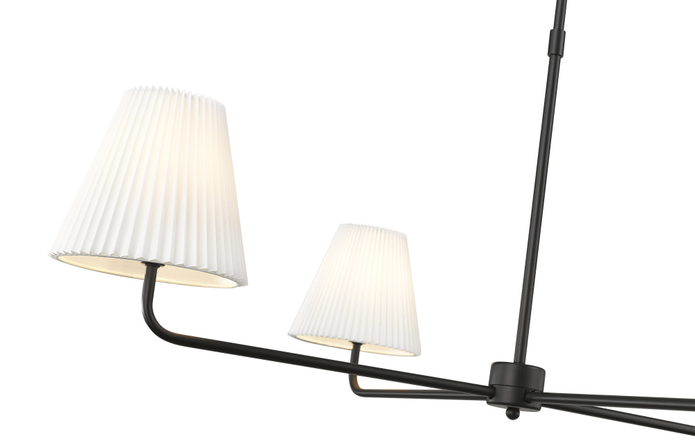 The Ami Family beautifully synthesizes a modern profile with traditional styling to create a thoroughly unique design aesthetic. The fixtures, finished in either matte black or vintage brass, are comprised of crisp, clean lines arcing gently upwards and capped with vintage style white fabric pleated shades. Available as 1-light sconces, 2-light island pendants, and 4-light chandeliers, these fixtures create a light and airy aesthetic for any space.