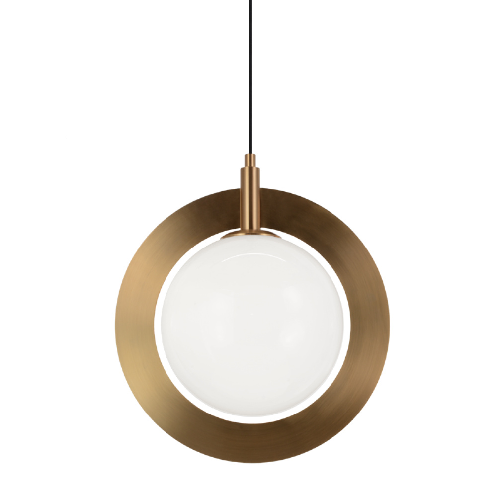 A stunning yet simple pendant designed with circular elements. Astro features Clear or Opal Glass, surrounded by a bold metal ring. Available in 2 finishes: Aged Gold Brass and Black.