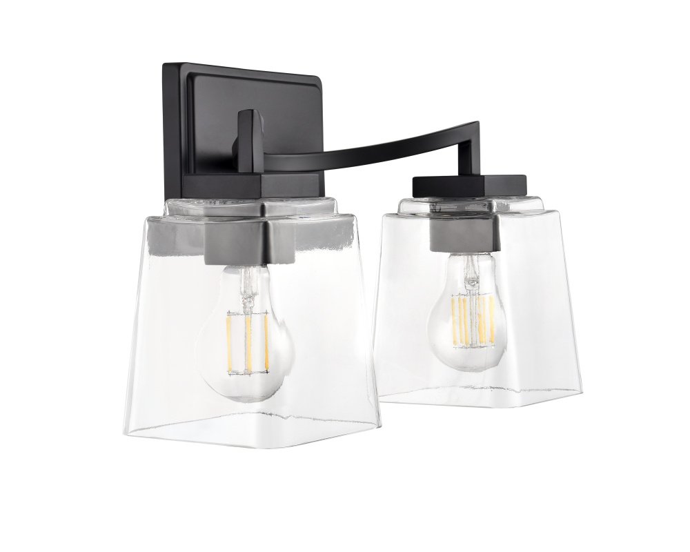 Sleek arced lines and unique square-shaped, clear glass globes infuse the Avenna Family of vanity lighting with a dynamic sense of motion and an elegant flair. Finished in modern gold, polished nickel, matte black, or brushed nickel these exquisite fixtures are available in 2- or 3-light options. Perfect for any interior design scheme, these vanity lights transform any bath space with a bold and sumptuous design statement.