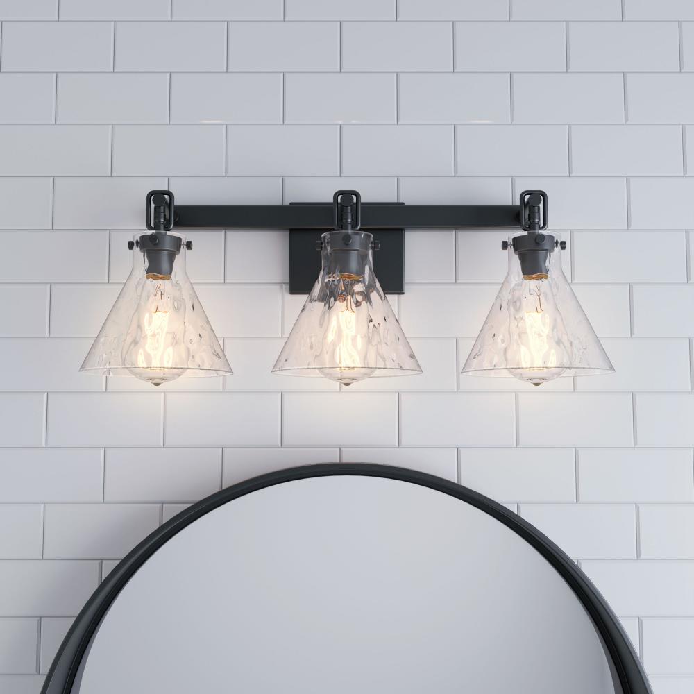 The Barlon Collection of vanity and pendant lighting provides a unique touch of style with artfully flared, clear water glass shades. The fixtures are a modern take on classic hook-style lantern lighting and are available in matte black, polished nickel, vintage brass, or modern gold with 1-light, 2-light, and 3-light options. This collection is the perfect look for a modern farmhouse or industrial-style loft.