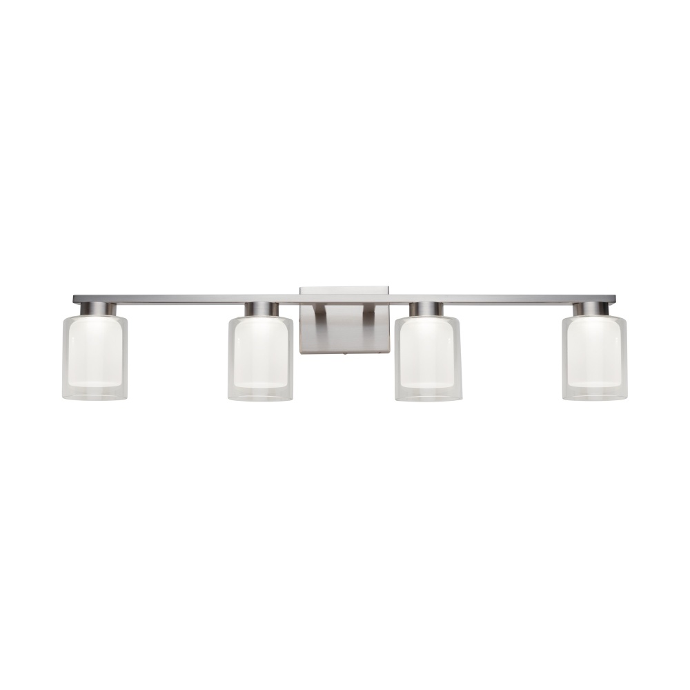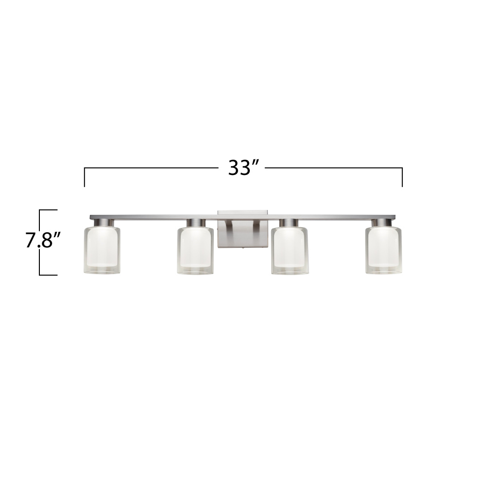 The Saville bathroom vanity collection boasts a distinctive double glass design, with a clear outer layer and a soft white inner layer that imparts a warm and inviting glow. To complement the elegant glasswork, the frame is adorned in a rich brushed nickel finish, adding a touch of sophistication to the overall design of this exquisite bathroom vanity collection. Additionally, the models in this collection come with a convenient LED switch, allowing users to effortlessly adjust the color temperature from 3000, 4000, and 5000 kelvin for a customizable and ambient lighting experience. 4 light wall sconce shown. (Also available in a single and 3 light versions.)
