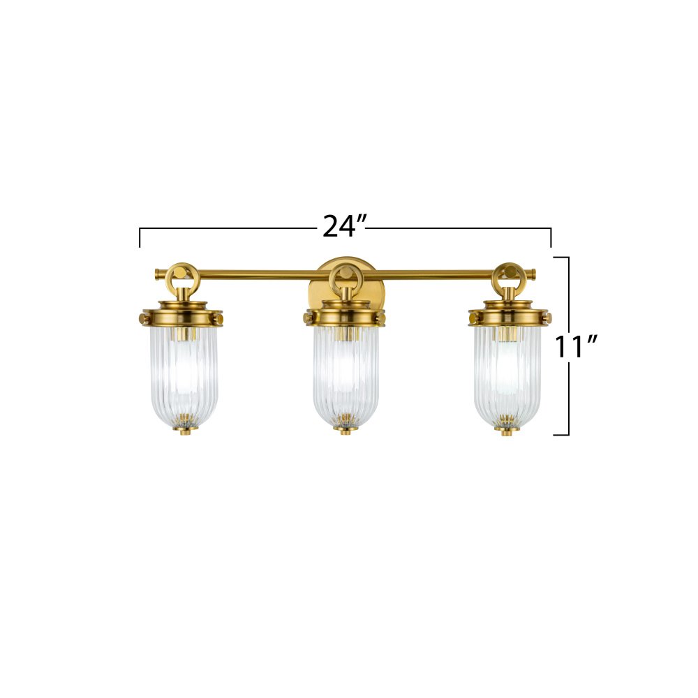The Myla Collection 3 light wall sconce by Kevin Kraemer is a captivating blend of vintage charm and refined elegance, featuring a radiant brass frame that beautifully complements its clear ribbed glassware. The timeless design creates a warm and inviting glow, making it a stunning centerpiece in any setting. Perfectly crafted for those who appreciate classic sophistication with a modern touch. Great for any bathroom setting.