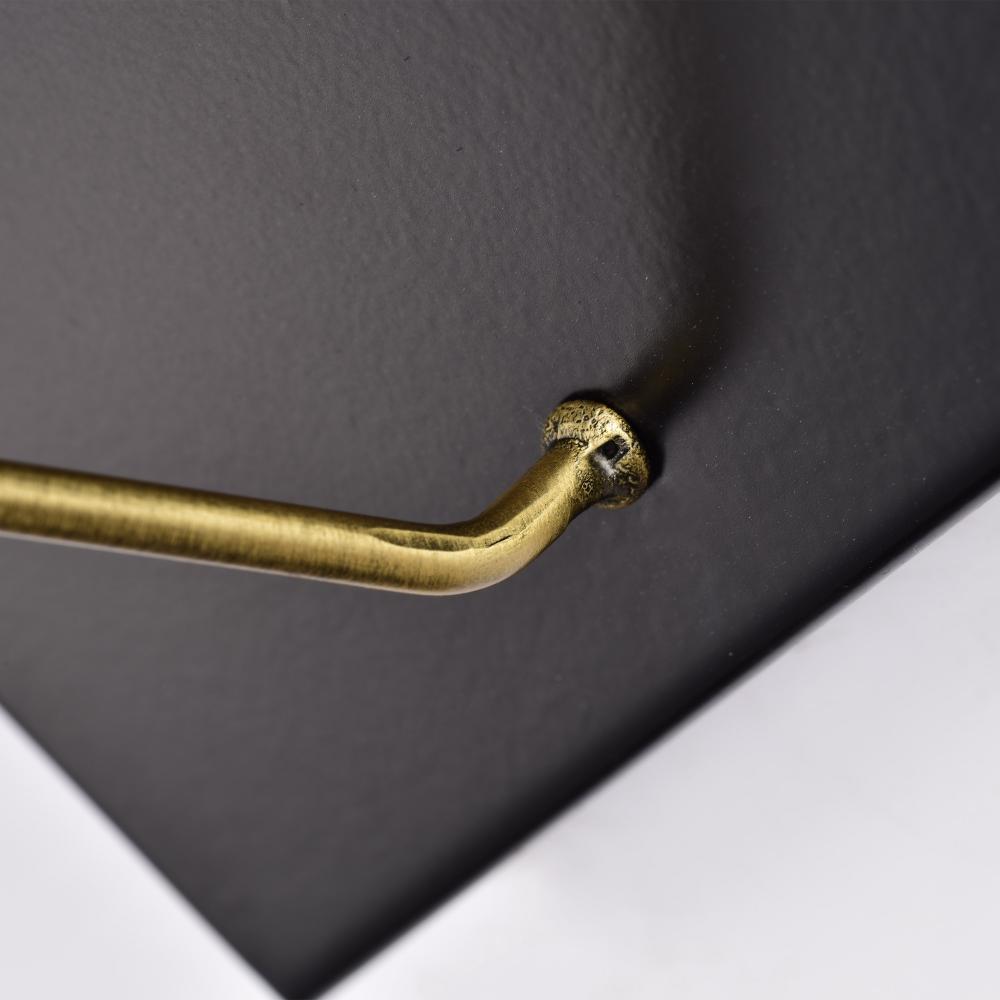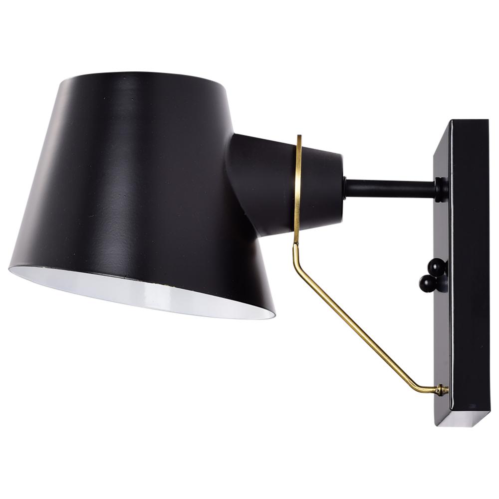 Finished in black with burnished brass accents and matching metal shade