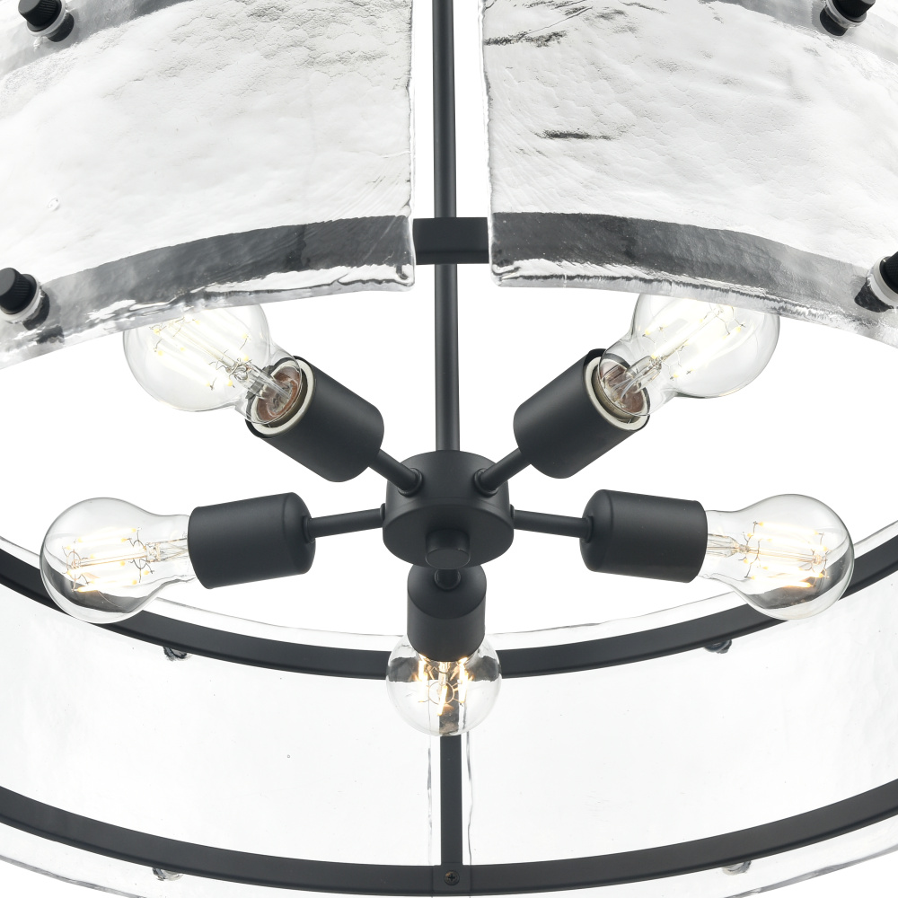The Bennetti Family of semi-flush mount and chandelier lighting introduces a luxurious design aesthetic into any modern or transitional space. The dynamic lines of the fixtures are punctuated with minimal hardware and are available in either matte black or polished nickel. The understated structure creates the perfect framework for the water glass panels, which provide a sumptuous, dappled lighting effect, perfect for a dining room and foyer.