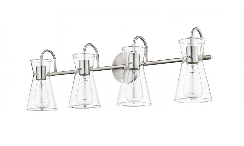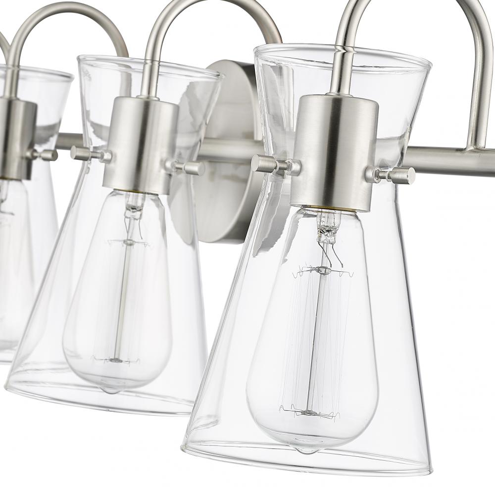 Distinctive beaker-shaped clear glass globes define the look of the Camellia Collection of vanity lighting. The overall design ensures well-defined lighting without shadows in the most needed spaces. The fixtures, featuring swan-neck lines and finished in modern gold, brushed nickel, or matte black, complete the overall design-forward effect and are available in 2-light, 3-light, and 4-light options.