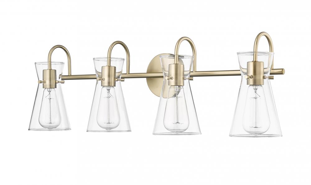 Distinctive beaker-shaped clear glass globes define the look of the Camellia Collection of vanity lighting. The overall design ensures well-defined lighting without shadows in the most needed spaces. The fixtures, featuring swan-neck lines and finished in modern gold, brushed nickel, or matte black, complete the overall design-forward effect and are available in 2-light, 3-light, and 4-light options.