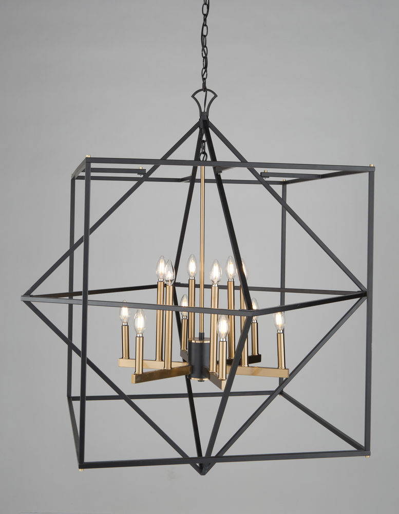 Linear in design, the Roxton collection is comprised of a matte black exterior cage which a diamond within a square that encases a harvest brass inner chandelier cluster. 12 light shown (smaller versions available)
