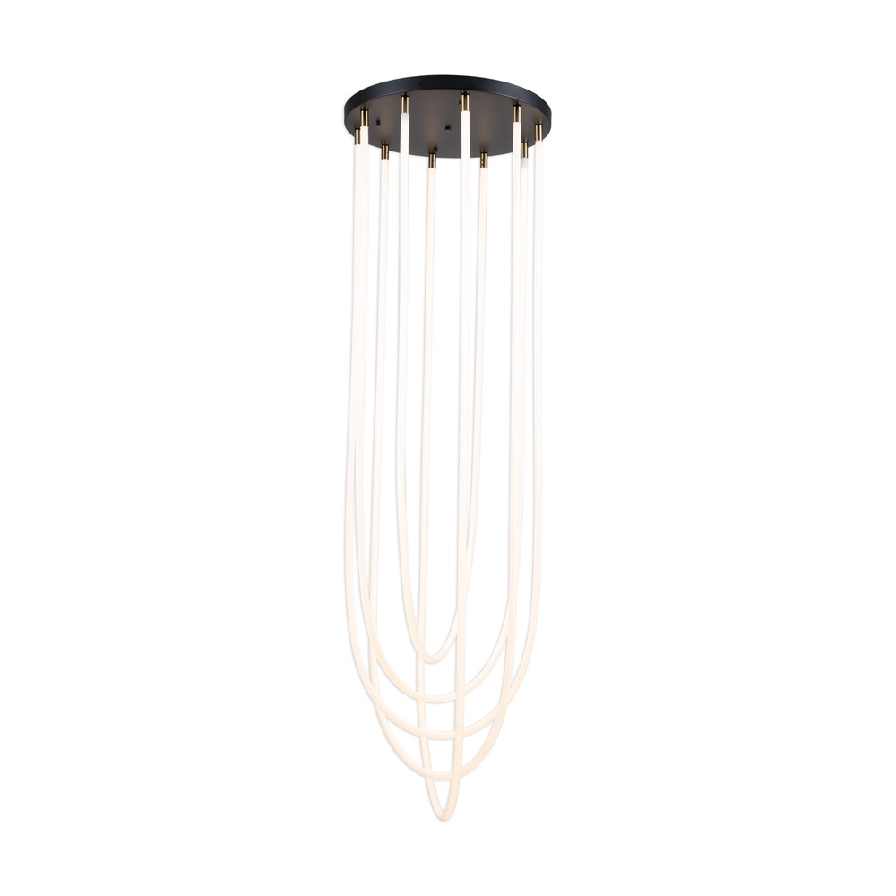 The Cascata Collection, designed by Kevin Kraemer, features a sleek and minimalist design, combining precision craftsmanship with modern aesthetics. The frame is black with brass accents. The bright LED illuminated silicone drapes throughout giving this collection an illusion of weightlessness. This eye-catching collection is a perfect complement to any surrounding. The model shown is a foyer type chandelier. Great for a heigh ceiling or staircase. (There is an optional adapter to lengthen this chandelier)